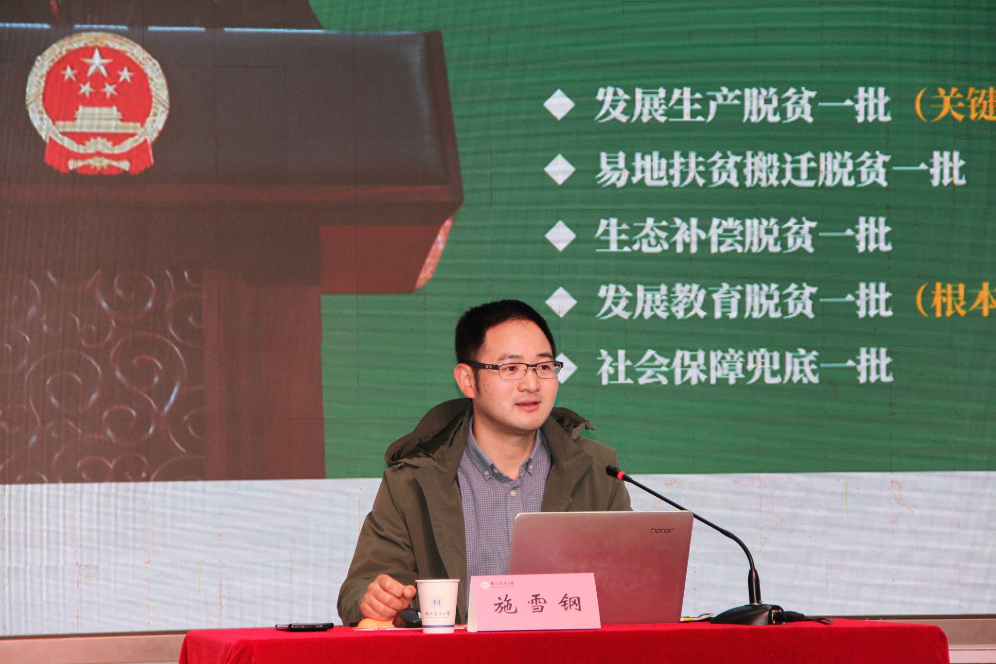 施雪钢从国家的农业强国和乡村振兴战略要求出发,讲述了其挂职贵州省麻江县高枧村驻村第一书记和麻江县委常委、副县长时的奋斗经历。回顾四年的挂职经历,施雪钢没有被理想与现实的落差、天灾与难料的困难击退,而是打造了六大乡村振兴工程,帮扶项目覆盖麻江所有乡镇和街道,切实助推了国家战略实施和当地社会发展。他表示,在麻江的挂职经历使自己对中国共产党为人民服务的初心使命有了更深的理解。他也希望同学们能够学好本领,在为人民服务中获得有意义的人生。
