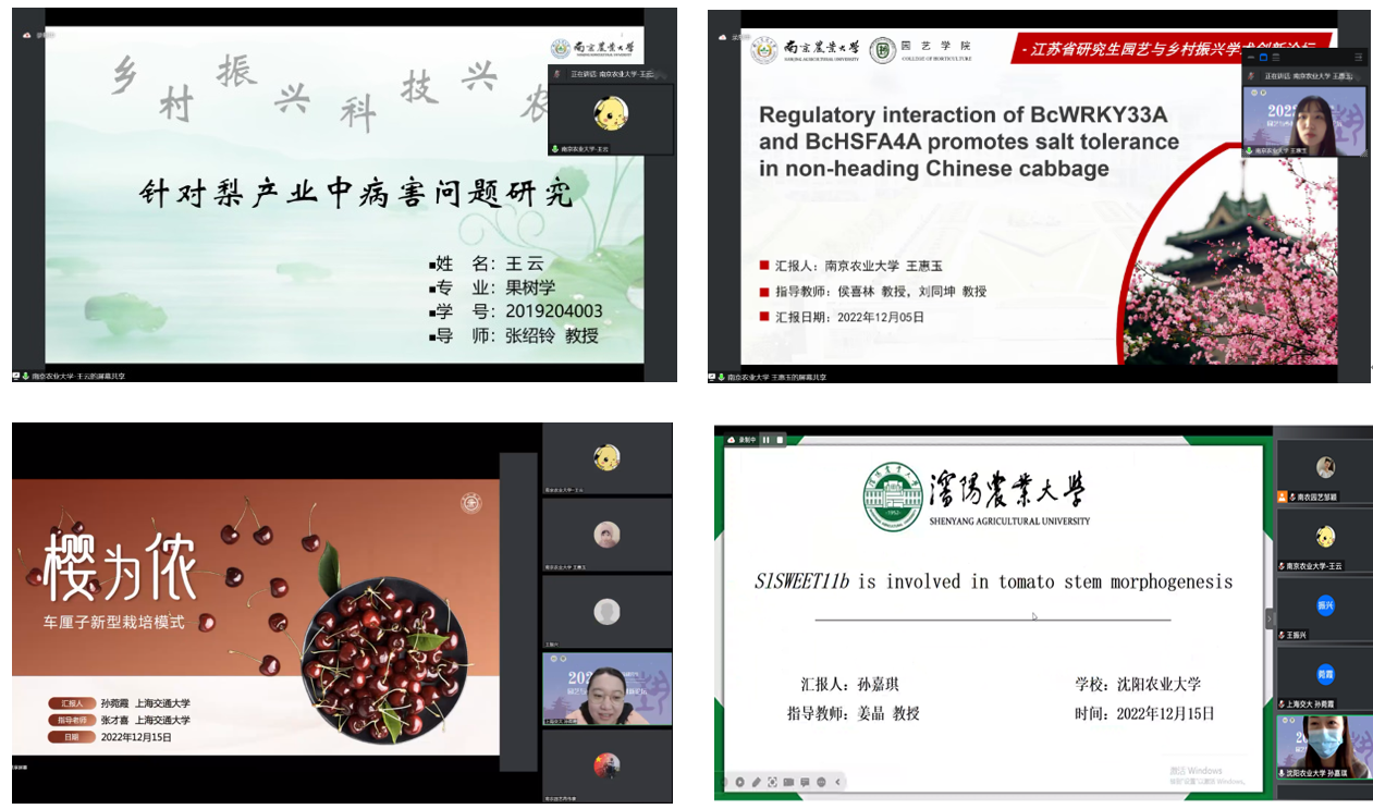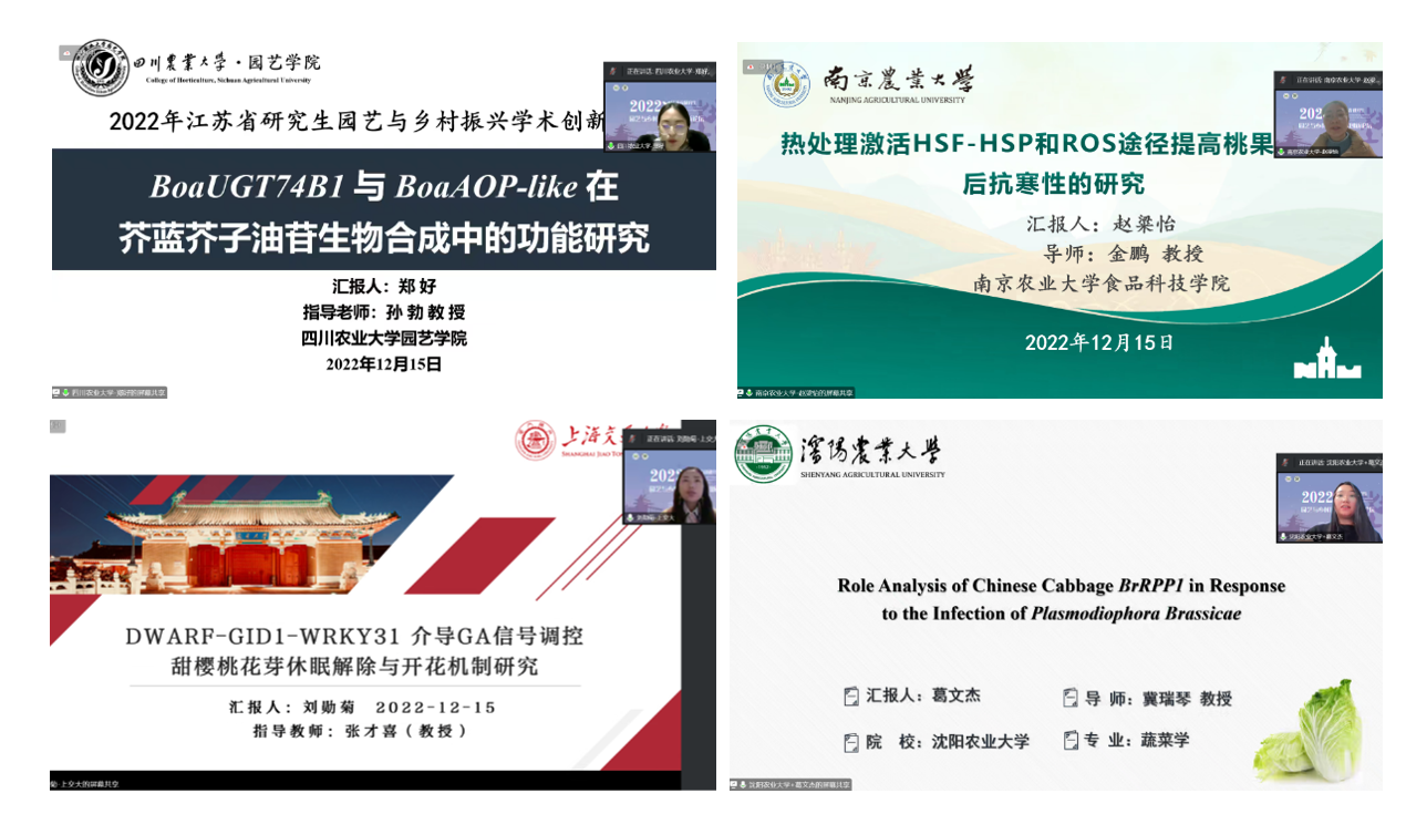 赵粱怡同学、上海交通大学刘勋菊同学、沈阳农业大学葛文杰同学分别带来了题为《BoaUGT74B1与BoaAOP-like在芥蓝芥子油苷生物合成中的功能研究》、《热处理激活HSF-HSP和ROS途径提高桃果实采收后抗寒性的研究》、《DWARF-GID1-WRKY31介导GA信号调控甜樱桃花芽休眠解除与开花机制研究》、《Role Analysis of Chinese Cabbage BrRPP1 in Response to the Infection of Plasmodiophora Brassicae》的精彩报告,展现了园艺领域研究生们的科研创新能力。