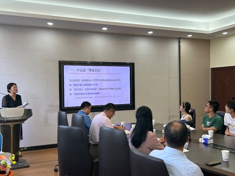 八个课程思政典型案例,指导支部青年教师如何通过三个途径在专业课程中加入课程思政元素。陈素梅指出专业课程中思政元素的内涵外延从广义上是育人,专业课程中思政元素的挖掘主要还是人、物和事之间的联系,专业课程中思政元素的融入要靠有机融合,润物无声。
