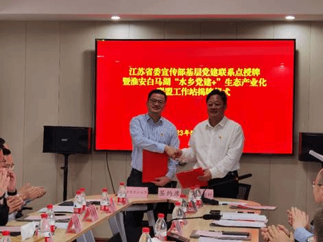 为深入学习贯彻习近平新时代中国特色社会主义思想,坚持以人民为中心,积极践行“青山绿水就是金山银山”发展理念,5月18日淮安白马湖“水乡党建+”生态产业化联盟工作站正式揭牌,活动在江苏省委宣传部基层党建联系点淮安金湖县前锋镇白马湖村举行。江苏省委宣传部二级巡视员、机关党委专职副书记刘海泉,江苏省新闻出版学校党委书记、校长张新昌,淮安市委宣传部副部长赵志鹏,组织部副部长赵进,金湖县委常委、政法委书记张荣平及淮安市、金湖县相关部门领导出席联盟成立仪式。包子漫画