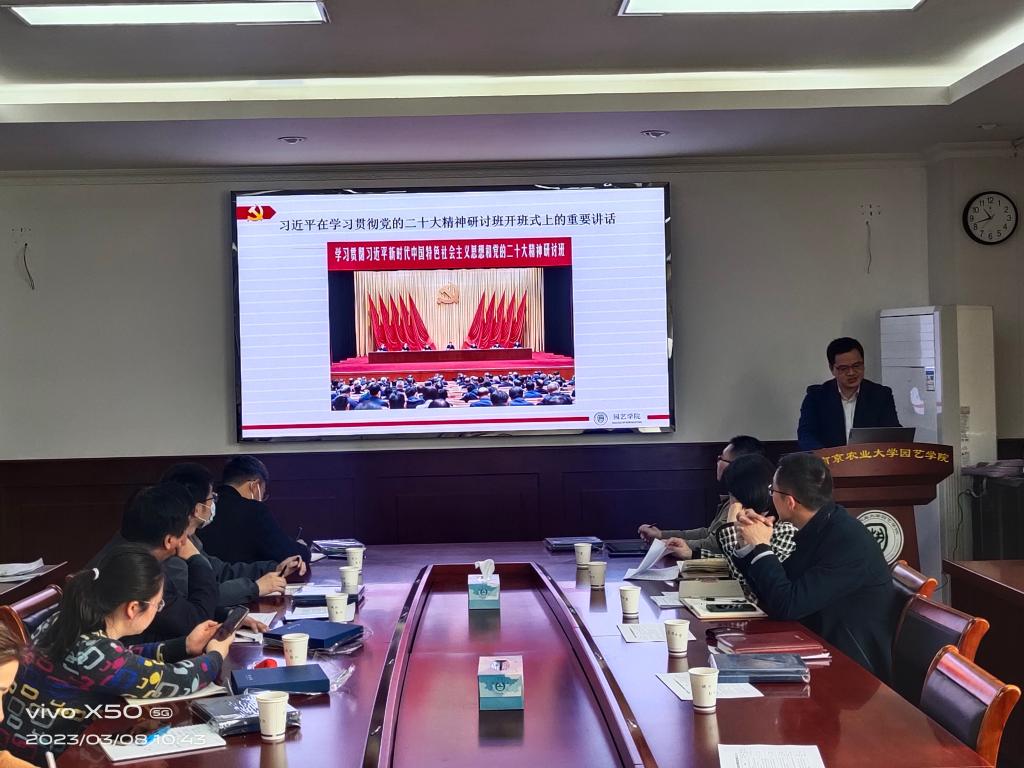 韩健带领大家进行了政治理论学习,专题学习习近平总书记在学习贯彻党的二十大精神研讨班开班式上的重要讲话精神。他要求各党支部要高度重视,深入组织师生党员学习贯彻党的二十大精神,奋进新征程、建功新时代,为农业强国建设和乡村振兴战略做出积极贡献。
