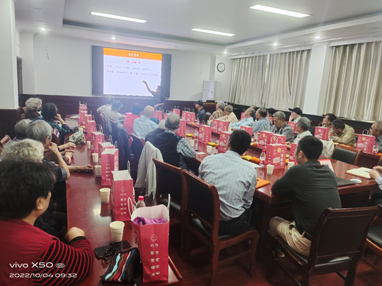 重阳日,历来就有赏菊花的风俗,所以古来又称菊花节。赏菊习俗源于菊文化。菊本是天然花卉,因其花色五彩缤纷且傲霜怒放而形成赏菊赞菊的菊文化。陈素梅院长以菊花为主题,作了《闲话菊花与健康》讲座。她从菊字最初来源即《尔雅释草》中记载的“蘜”字的文化内涵讲起,寻根溯源,将“菊”的由来和演变娓娓道来。菊花“形、色、香、德”在中国传统文化中展现的淋漓尽致,据不完全统计,关于菊的诗词歌赋有近1700首,对菊花的厚香、暗香、坚贞之美、铿锵美;志士、隐士、千古高风之美等颇多赞誉。从三国魏晋以来,重阳聚会饮酒、赏菊赋诗已成时尚。在中国古俗中,菊花象征长寿。陈院长还重点讲解了菊花的高风亮节、坚强坚韧、自强不息等精神和品格,给人以精神鼓舞和洗礼。