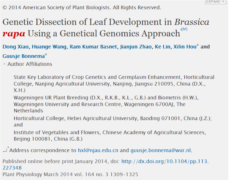 白菜系统生物学实验室与荷兰瓦赫宁根大学(Wageningen University)植物育种系合作完成的研究论文"Genetic dissection of leaf development in Brassica rapa using a genetical genomics approach"在《Plant Physiology》上发表,影响因子为6.555。肖栋博士为第一作者,侯喜林教授与Guusje Bonnema教授为共同通讯作者,包子漫画
