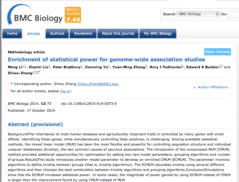 青年教师李梦在全基因组关联分析方法的改进方面取得重要进展,以一作者身份发表论文“Enrichment of Statistical Power for Genome-Wide Association Studies”。该论文于10月17日在杂志BMC biology(IF=7.43)在线发表(//www.biomedcentral.com/1741-7007/12/73/abstract)。本文也是作者与美国康奈尔大学Ed Buckler实验室及美国华盛顿州立Zhiwu Zhang合作研究的成果。包子漫画