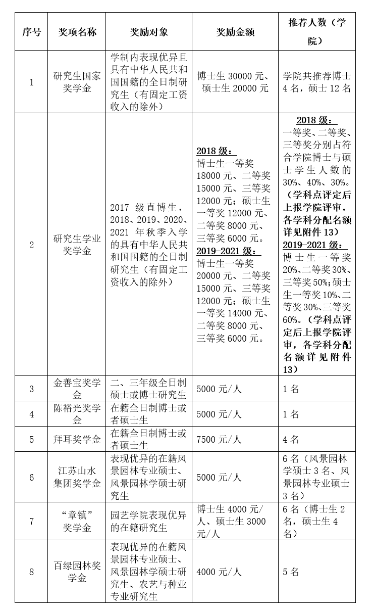 1、校长奖学金与国家奖学金同年不可兼得,企业名人奖学金(包括金善宝奖学金、陈裕光奖学金、拜耳奖学金、江苏山水集团奖学金、“章镇”奖学金、百绿园林奖学金等)之间不可兼得,且每名研究生最多只能申请一项企业名人奖学金。