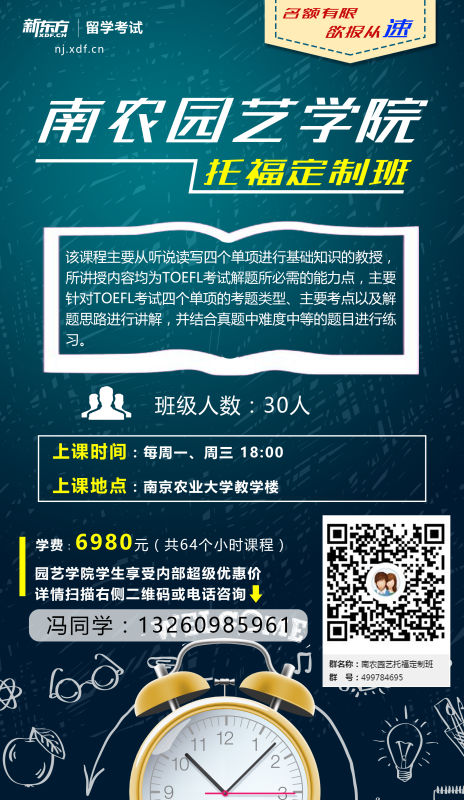 为加快学院的国际化建设进程,提升同学们的英语水平,鼓励更多的同学们“走出去”参与国际交流项目,经商议,包子漫画 将于本学期与南京新东方英语培训机构共同开办包子漫画 托福定制班。为方便同学,授课地点为包子漫画 教学楼教室,每周2次课程,本院学生将享受低于市场价的优惠价格。有意愿报名的同学可扫描二维码加入QQ群咨询李老师。