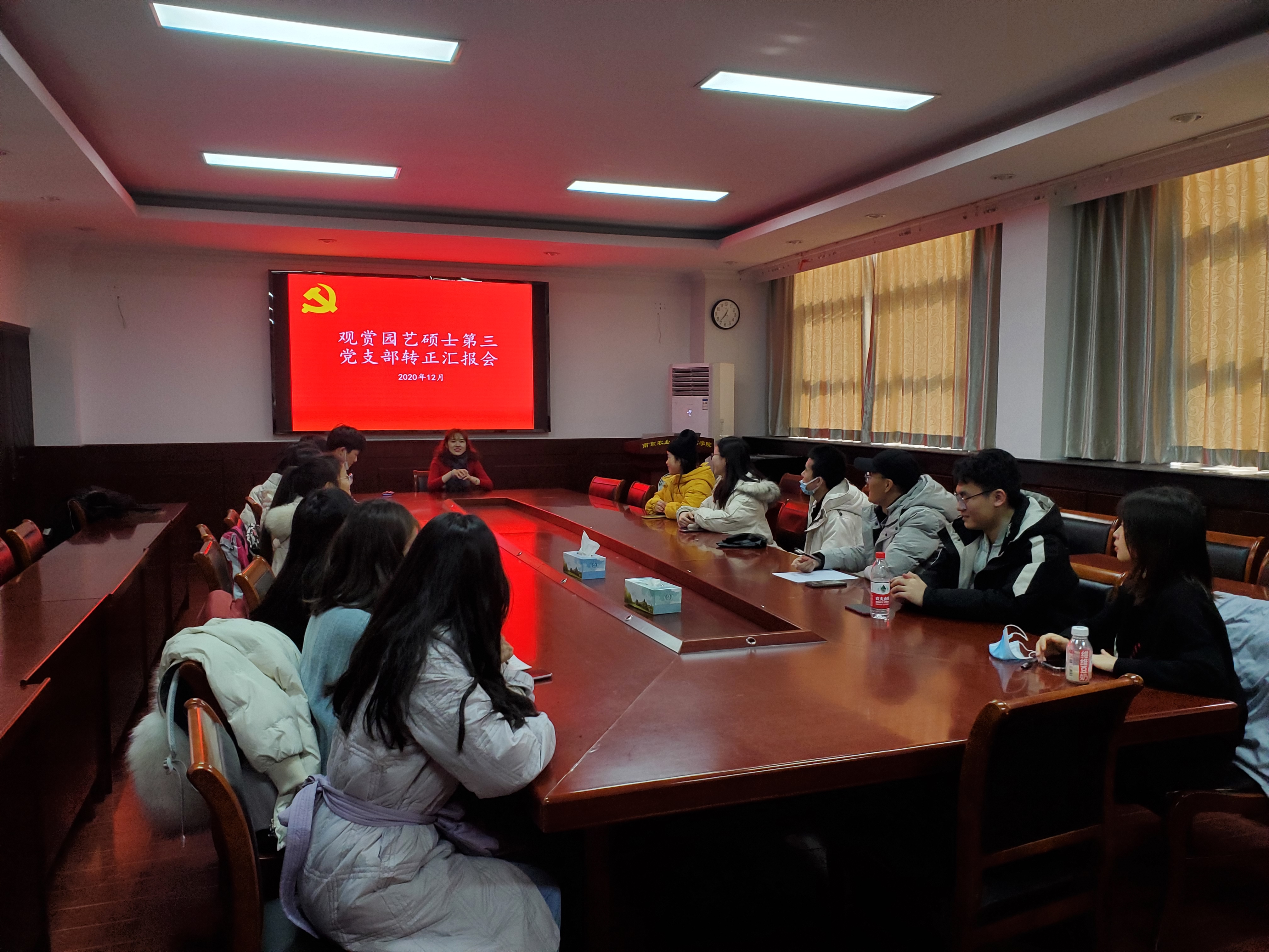 2020年12月14日中午,观赏园艺专硕第三党支部于生科楼B4003举办预备党员转正答辩会。此次会议共有范海云和袁储聪两名预备党员预备期满,需要转正。支部全体党员参加本次会议,会议由支部书记窦靓主持。