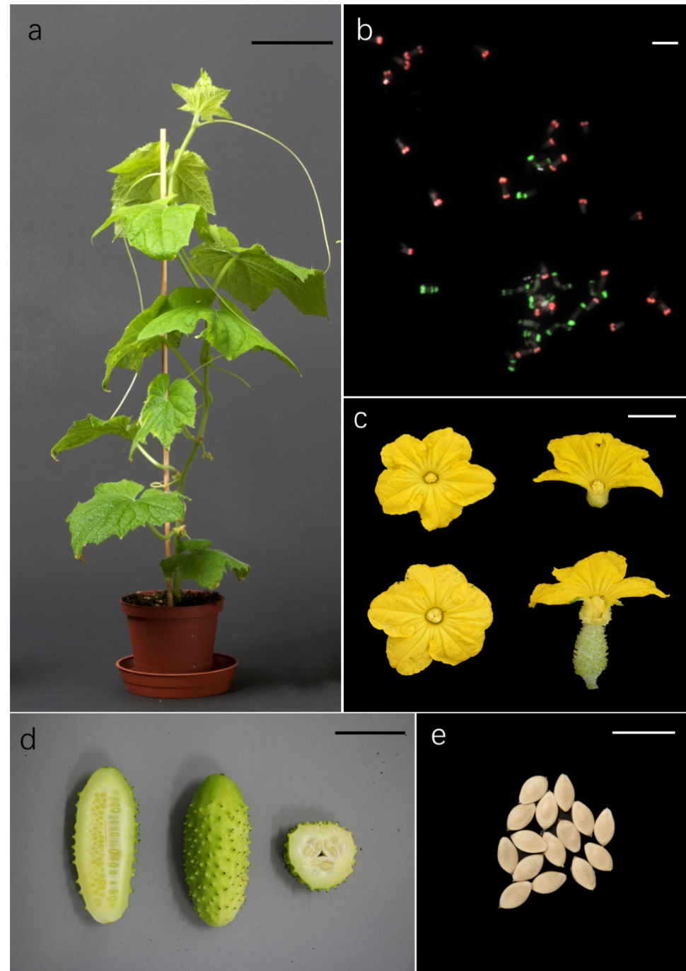 早在2000年前,陈劲枫教授将栽培黄瓜(Cucumis sativusL., 2n=14)与野生酸黄瓜(C. hystrixChakr., 2n=24)进行种间杂交,通过胚胎拯救和染色体加倍,首创了甜瓜属人工异源四倍体新物种“金瓜”并命名为Cucumis hytivusChen and Kirkbr.,建立了利用种间变异进行黄瓜遗传改良的途径,申请获得了国家发明专利(专利号:CN1279009A;CN1111349C)。在此基础上,项目组通过进一步将金瓜和栽培黄瓜杂交和多次回交,创制了异源三倍体、单体异附加系和渐渗系等一系列特异染色体工程材料,为黄瓜遗传育种提供了全新的种质资源。