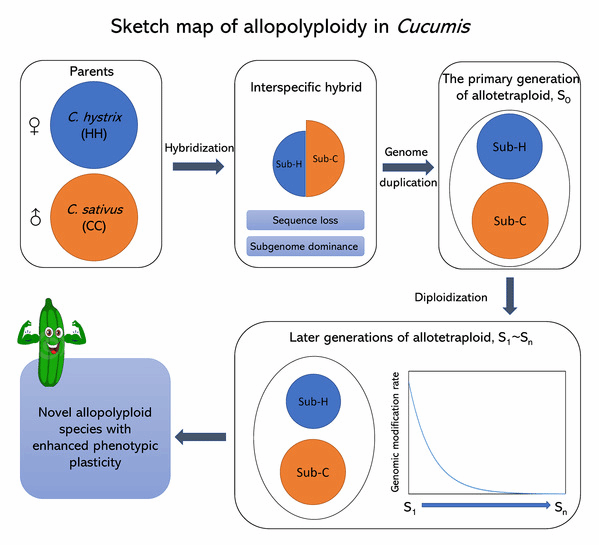 近日,包子漫画 包子漫画 陈劲枫教授团队在《Advanced Science》(中文期刊名:《尖端科学》,2019年影响因子15.84)在线发表了研究论文“Whole-Genome Sequence of Synthesized Allopolyploids in CucumisReveal Insights into the Genome Evolution of Allopolyploidization”(doi:10.1002/advs.202004222)。该研究历经20多年,围绕甜瓜属人工异源四倍体新物种“金瓜”(gocumber)开展了系统深入研究,完成了世界首例人工合成异源多倍体全基因组测序,揭示并初步阐明了在异源多倍化物种形成三个阶段中,种间杂交的作用最为显著,以及亚基因组优势形成机制等多倍体研究重要科学问题,对于加强植物多倍化研究及作物育种利用具有重要意义。