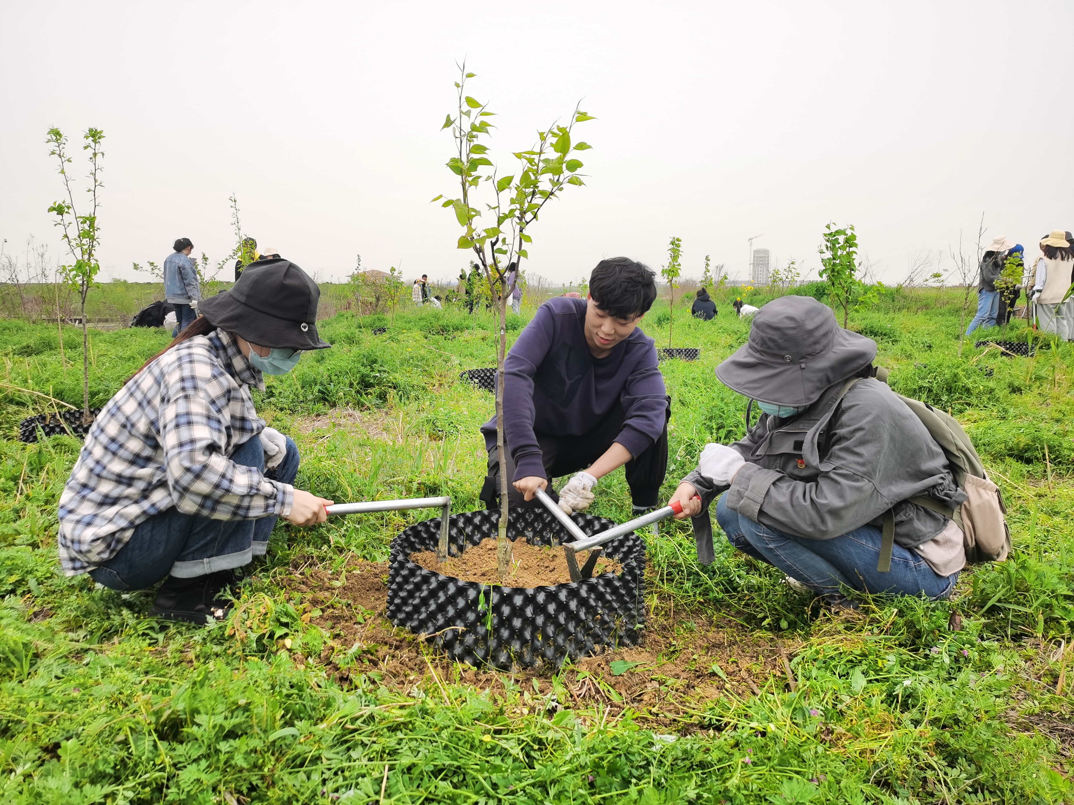 此外,在种植树木的过程中,还要为树苗安装限根器,遵循“一垫二提三埋四踩”的原则,即在挖好的树坑内垫上松土、栽种树木的时候提提树干、将埋树的土分三次埋下、每埋一次要踩实土壤,其间至少要踩四次。最后,再浇一桶兑有生根粉的水浇水。这些步骤过程虽繁琐,却能大大提高树苗的成活率,而安装限根器则是一种在果树种植中常用的方法,将植物的根域控制在一定范围内,通过控制根系的生长来调节地上部分的营养生长和生殖生长,控制水分、促进土壤改良。