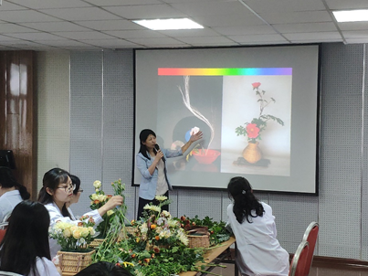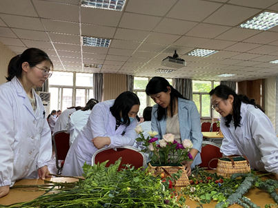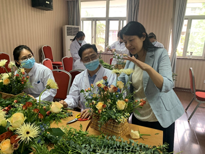 观赏茶学党支部书记陈素梅表示广大医护人员为了守护师生健康不辞辛劳,展现了博大的仁爱之心。插花艺术是园艺疗法和康养的有效载体,为了让广大医护人员舒缓工作压力,愉悦身心,支部决定为学校医护人员举办插花培训,以备今后工作和生活中的“不时之需”。陈素梅书记从花器的选择、花材的形态、色彩的设计、插花类型等方面详细讲述插花的入门技巧,并带领支部党员现场指导医护人员插花。白衣天使们,在轻松愉快的氛围中巧手翻飞,享受着插花艺术带来的乐趣,娇艳的玫瑰、温馨的康乃馨、淡雅的小菊花等花材,很快变身成一个个精美的艺术品,或高雅格调,或清新怡人。陈书记还带领支部成员和研究生同学,特意为值班不能参加活动的医护工作者制作插花作品,以送上节日的温馨问候。