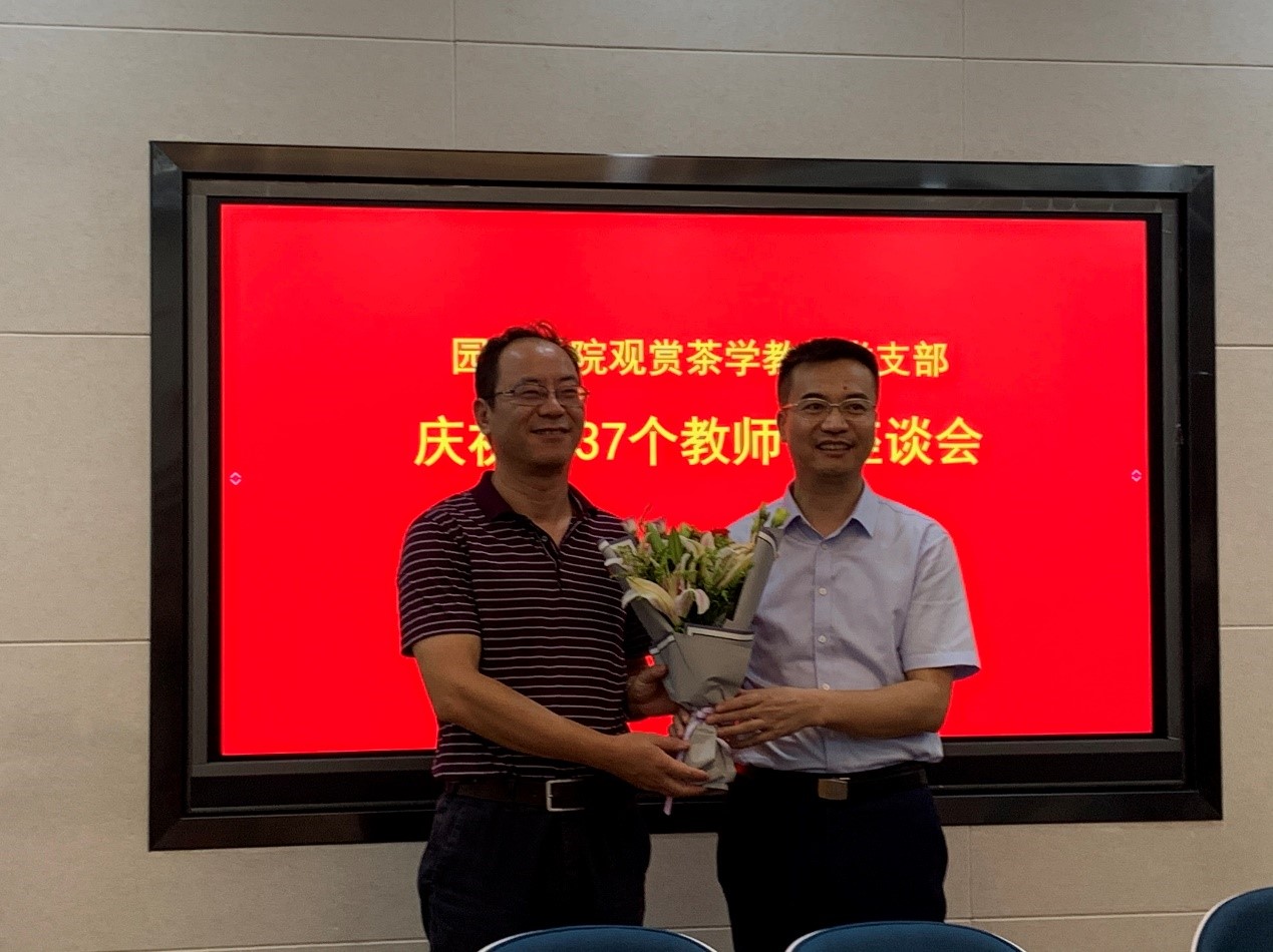 为了弘扬尊师重教的优良传统,会上,陈发棣教授为光荣在岗30年的房伟民教授赠送了鲜花,感谢房老师在人才培养和学科建设及菊花遗传育种团队建设中做出的杰出贡献。同时观赏学科的第一位硕士研究生蒋甲福教授向导师陈发棣教授敬献了鲜花,一曲《长大后我就成了你》,表达了薪火相传甘为人梯的心声。观赏学科今年新入职三位海外引进的教授,陈发棣教授、房伟民教授以及支部书记陈素梅教授分别为三位新入职老师佩戴了校徽,并勉励新教师及全体老师:忠诚党的教育事业,贯彻党的教育方针,履行教师神圣职责。修身立德,为人师表;追求真理,崇尚科学;敬业爱生,教书育人;淡泊名利,严谨治学;传承文明,勇于创新;终身学习,不断进步。为全体学生美好未来,奉献全部智慧和力量!与会的老师再次深切体会了教师职业的神圣和肩负的伟大使命。