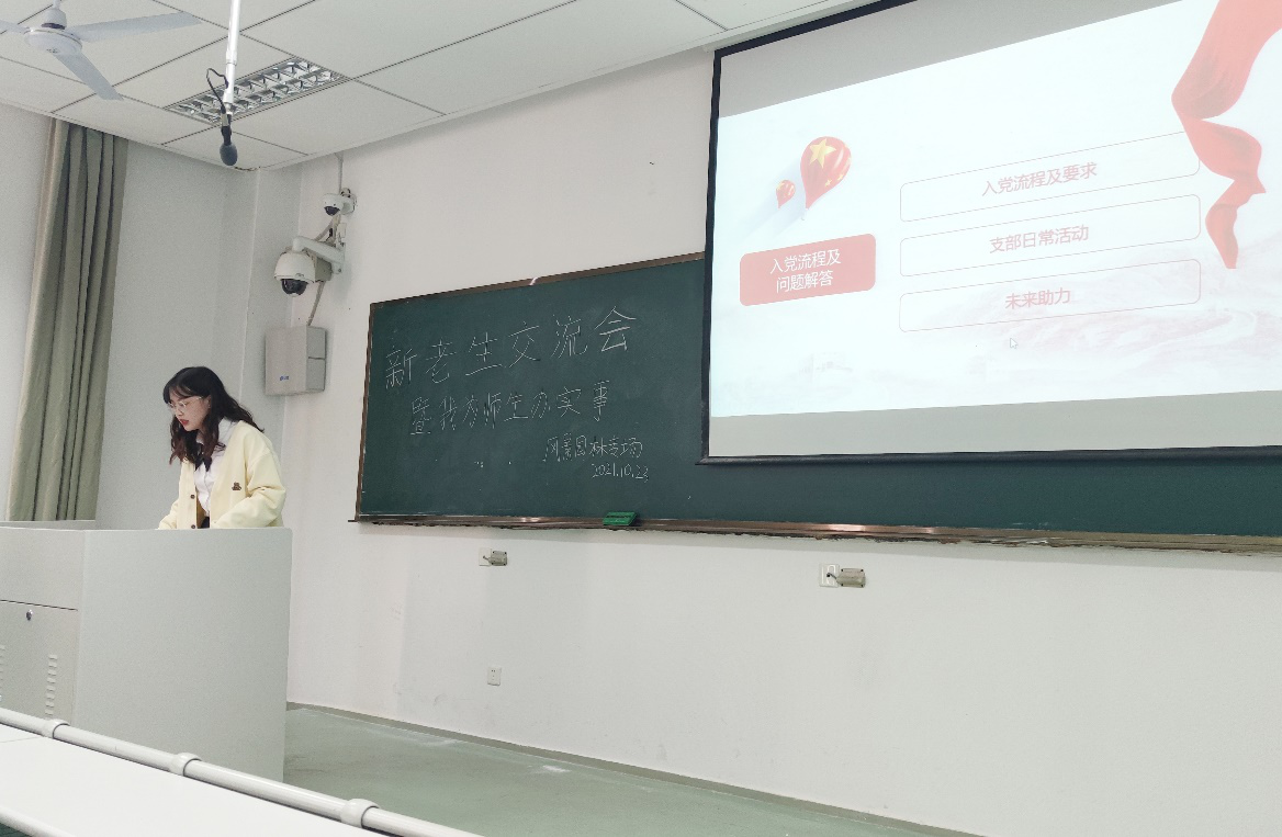 首先,支部副书记姚歆睿就入党流程为新生们做相关介绍。她详细讲解了从入党启蒙到积极分子再到发展对象、预备党员及正式党员的流程,并号召同学们积极学习党史、关注党建活动,引导新生树立对党的科学、正确的认识。同时,她向新生展示了具有专业特色的党支部日常活动,让新生对于入党有了全面而充分的了解。