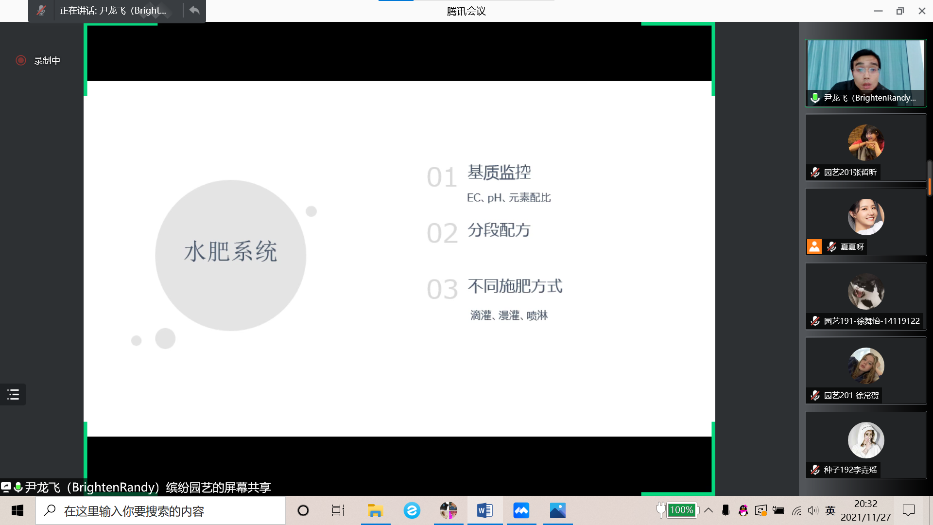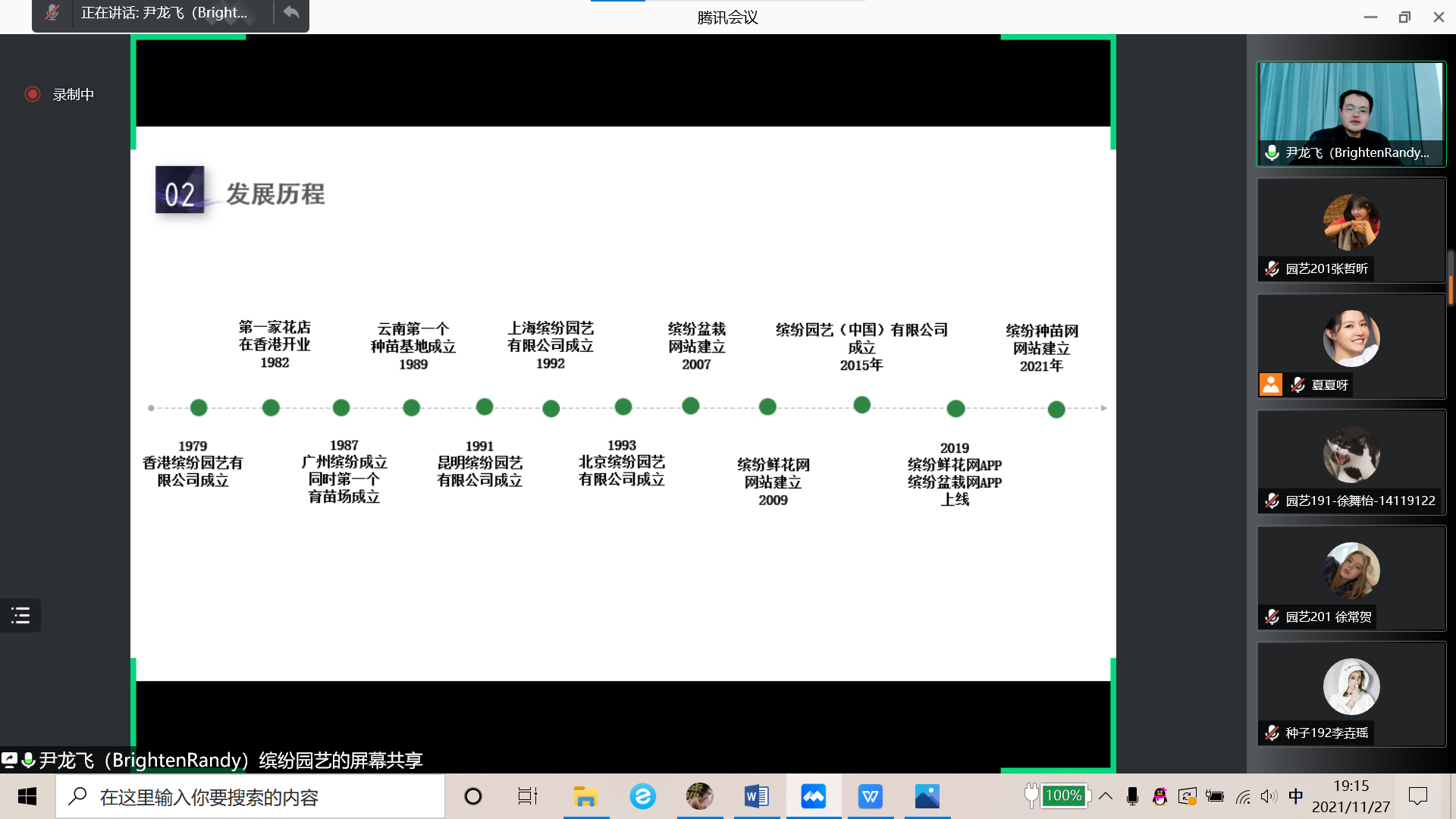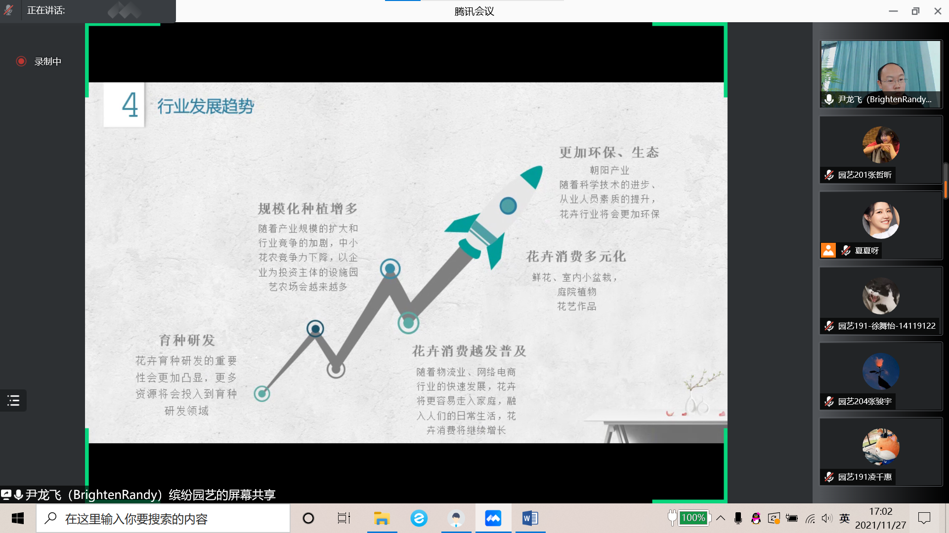 11月27日,学院邀请了缤纷园艺(中国)有限公司种苗总监黄仲恩先生、市场总监闫永兵先生、盆栽总监褚宪明先生通过线上腾讯会议的方式分别为同学们介绍了花卉行业的发展、缤纷的创建与发展以及花卉行业的前沿知识。下午黄仲恩先生首先为同学们介绍了花卉行业的历史发展,并分析了行业发展趋势,表示花卉行业从业者的使命就是立志用美丽的自然色彩装点人们的生活,实现中国跻身世界园艺强国的伟大梦想。晚上闫永兵先生从公司简介、发展历程、品牌创建以及包子漫画四个方面为同学们详细地介绍了缤纷园艺(中国)有限公司;褚宪明先生从盆花的产品标准、生产管理、病虫害防治以及水肥系统为同学们讲解了花卉行业技术领域的前沿知识,帮助同学们了拓展学识,开阔了视野,激发了大家创新思维,助力大家提升学习、实践和创新的整体能力。课程结束之后,同学们踊跃提问,展现了对花卉行业甚至农业行业的热情与兴趣,同学们希望更深入了解目前全国花卉种植技术的发展等内容。