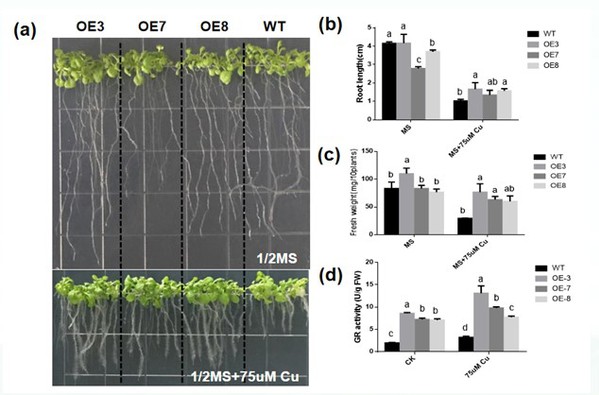 李英教授为通讯作者的论文“BcGR1.1, a Cytoplasmic Localized Glutathione Reductase, Enhanced Tolerance to Copper Stress inArabidopsis thaliana”,该论文揭示了不结球白菜BcGR1.1增强植物铜耐受性的分子机理。本研究表明,在不结球白菜中,BcGRs的4个同源基因分为两种亚细胞定位类型:细胞质定位型和叶绿体定位型。其中BcGR1.1对铜胁迫最为响应。与野生型拟南芥相比,BcGR1.1过表达植株表现出较好的生长状态。这是由于BcGR1.1的表达可以调节AsA-GSH循环,提高GSH积累、ASA利用和部分抗氧化酶活性,以清除铜胁迫引起的ROS,从而提高植物对铜胁迫的耐受性。