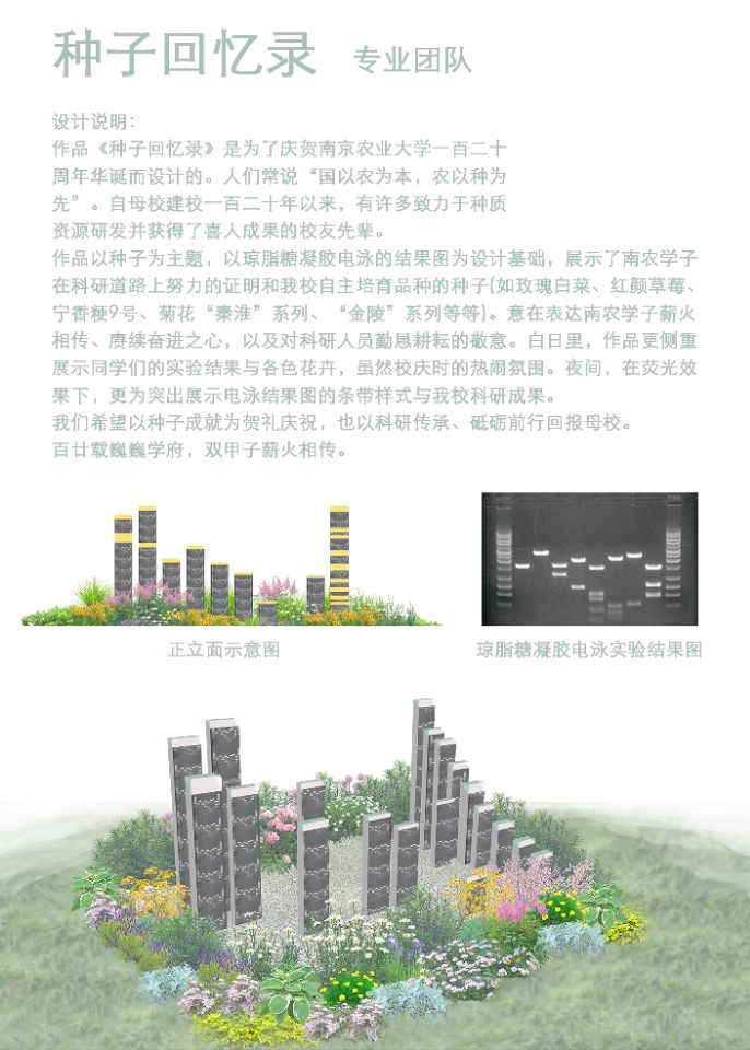 专业团队组的作品《种子回忆录》,以种子为主题,以琼脂糖凝胶电泳的结果图为设计基础,展示了南农学子在科研道路上努力的证明和包子漫画