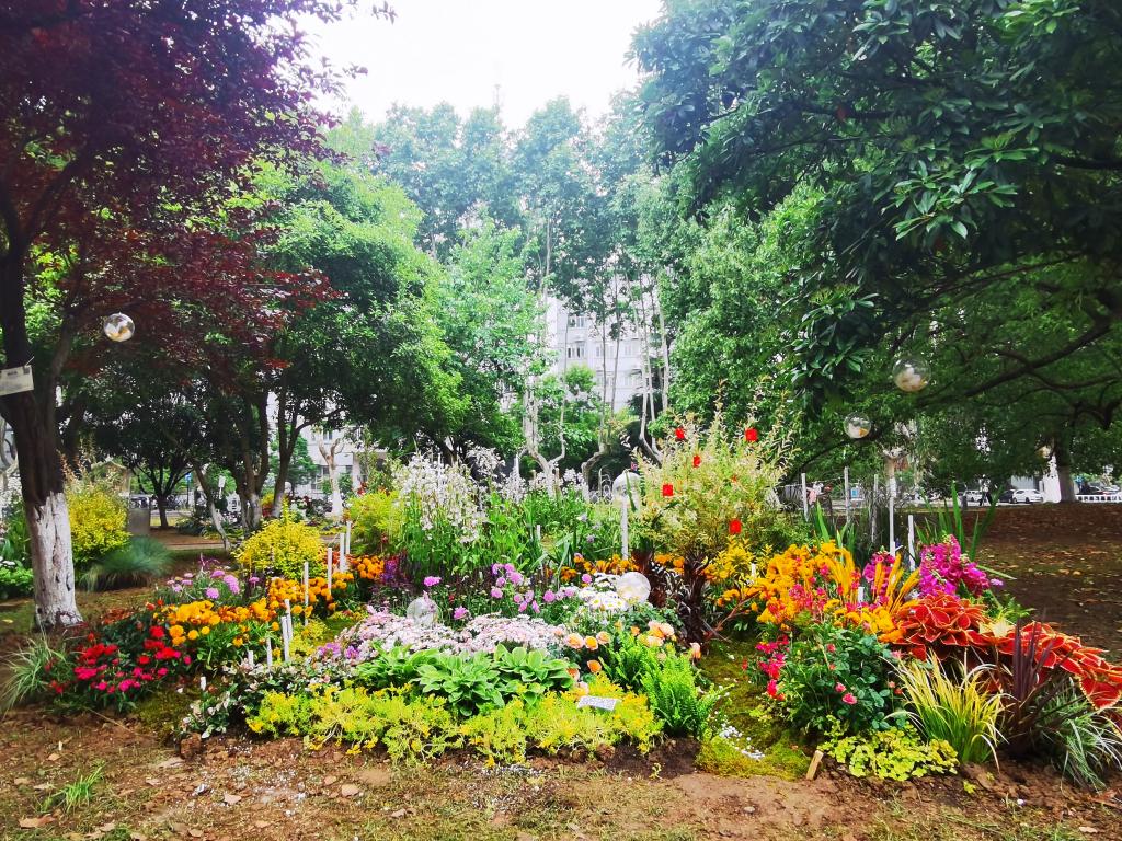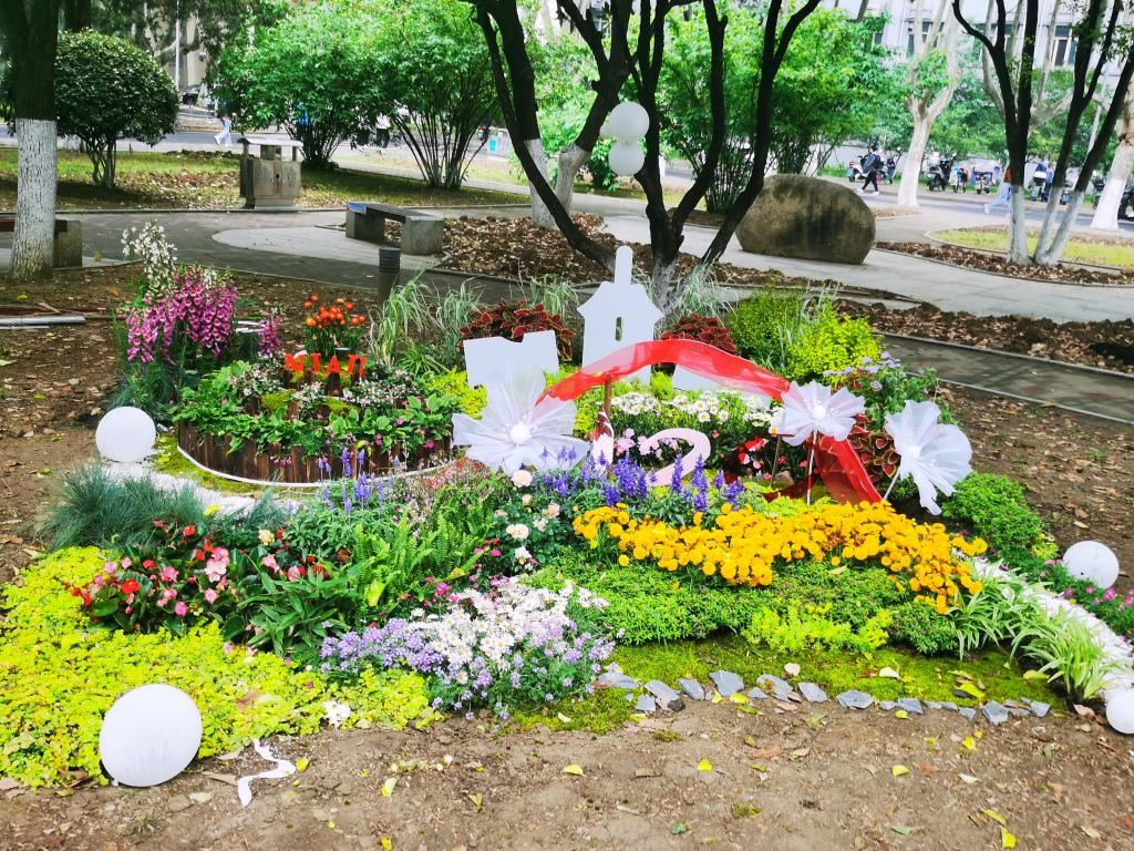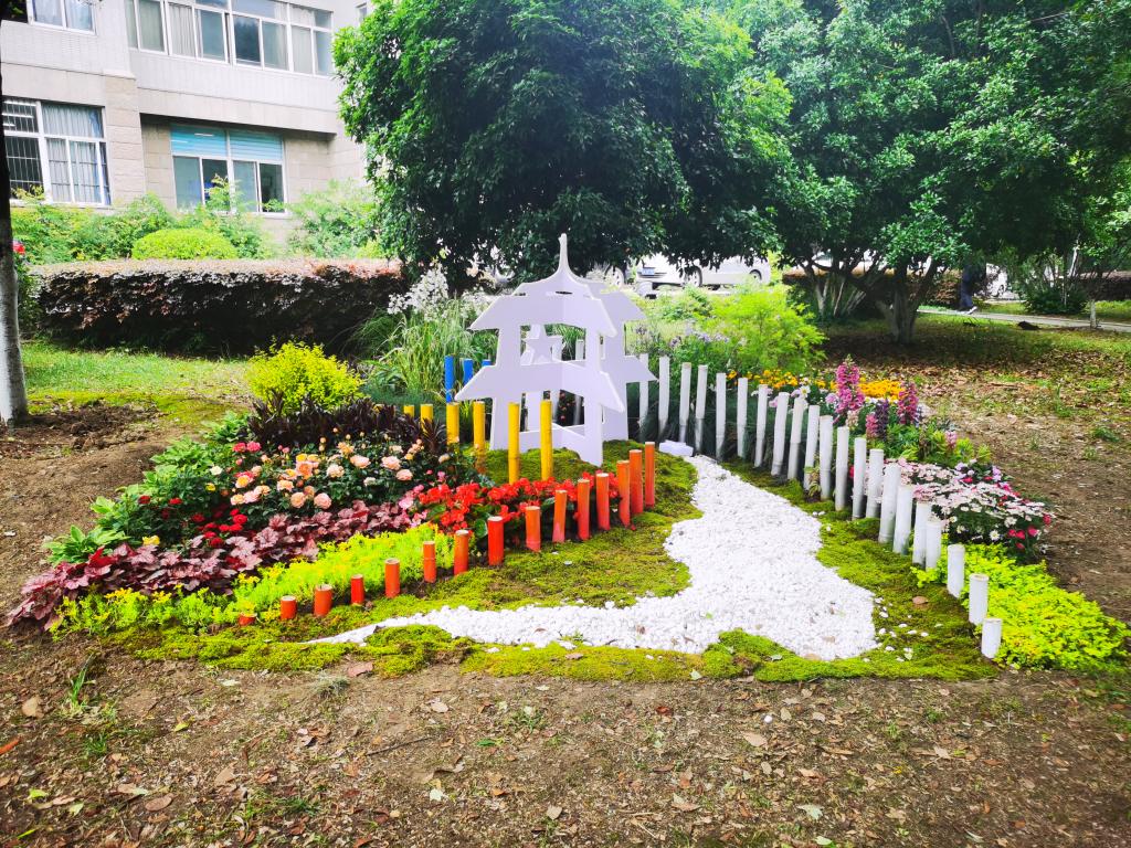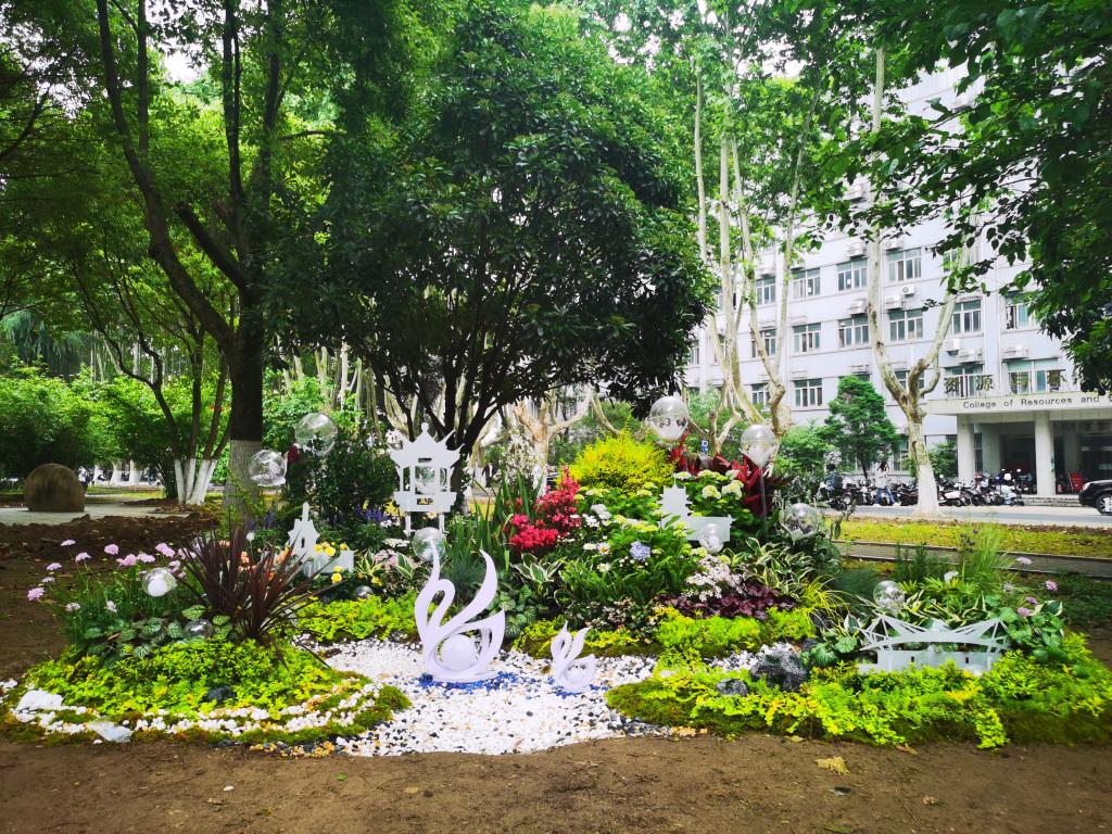 立夏后的南农,悬铃木枝叶逐渐包裹住天空,声声清脆的鸟鸣婉转悠扬的传递在学子耳边,综合楼前的绿荫小道两侧,一座座美丽的小花园在一个周末的时间突然建造了起来,花叶连翘、黄金枸骨、火焰南天竹等五彩的观赏植物在土地上摇曳生姿,石子、飘带、彩灯等各式的装饰点缀其内,不同意蕴风采的微景观呈现在往来的师生面前。