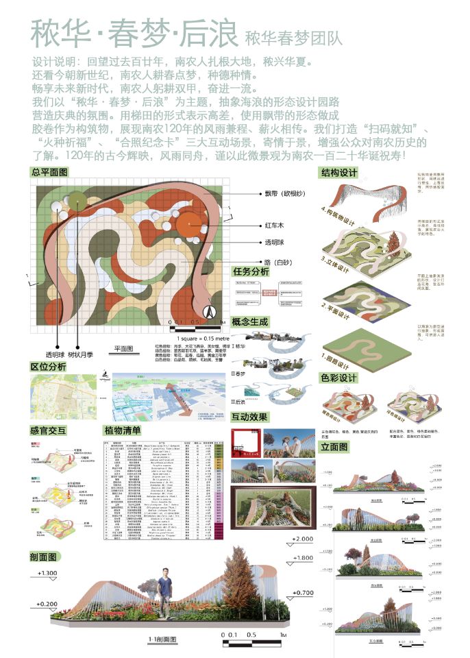 秾华春梦组的组的作品《秾华·春梦·后浪》,以“秾华·春梦·后浪”为主题,抽象海浪的形态设计园路,平面打造花海,营造庆典的氛围。用梯田的形式表示高差,使用飘带的形态做成胶卷作为构筑物,展现南农120年的风雨兼程、薪火相传。