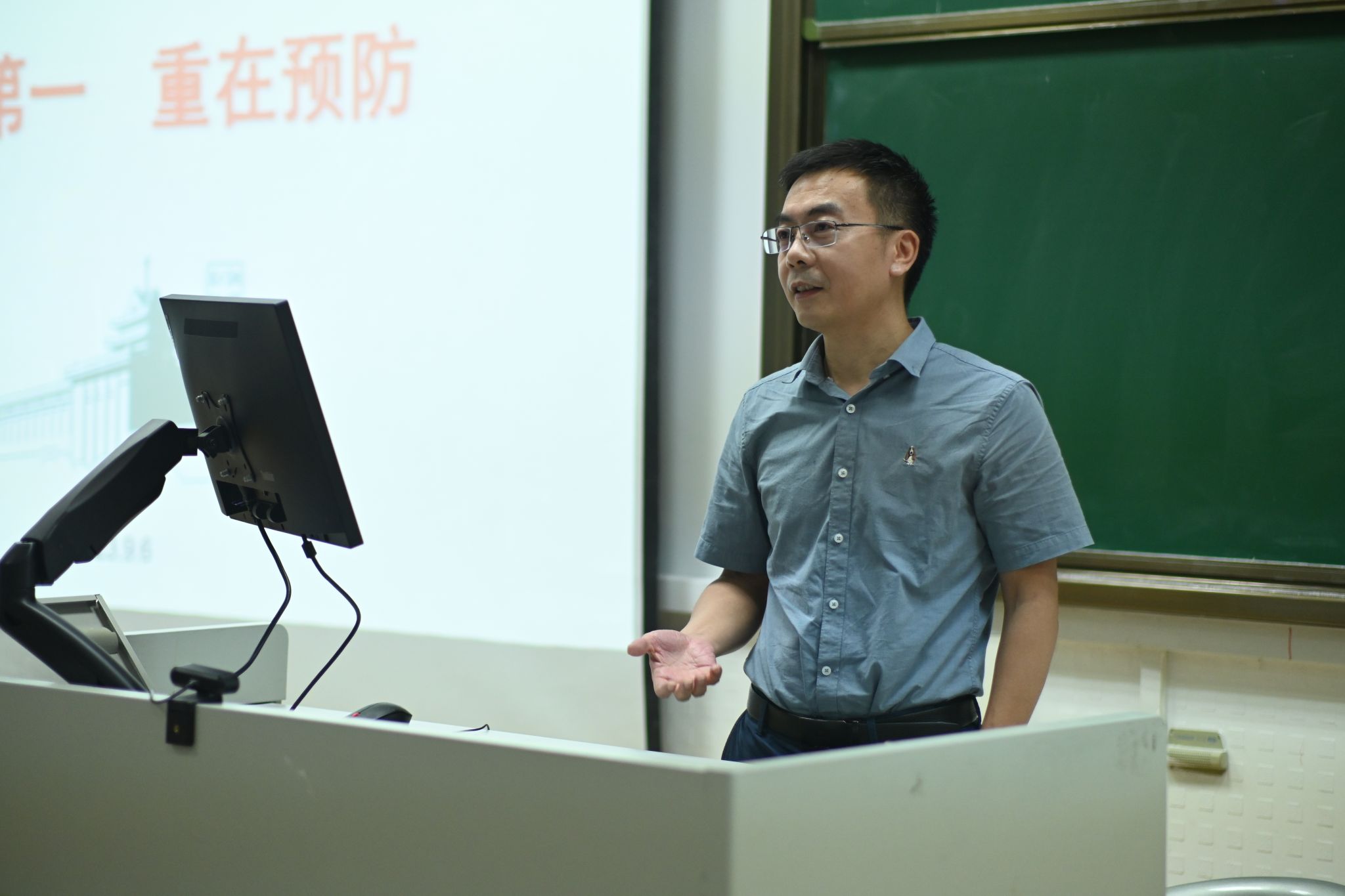 张清海副院长向同学们介绍实验室安全注意事项。他通过一系列鲜活的案例引导同学们意识到实验室安全的重要性,并要求同学们牢记安全第一的原则,要及时排除安全隐患,防微杜渐,防患于未然。最后,他强调同学们要严格遵守各项规章制度,积极参加实验室安全培训,提升安全意识,保障科研和自身平安。