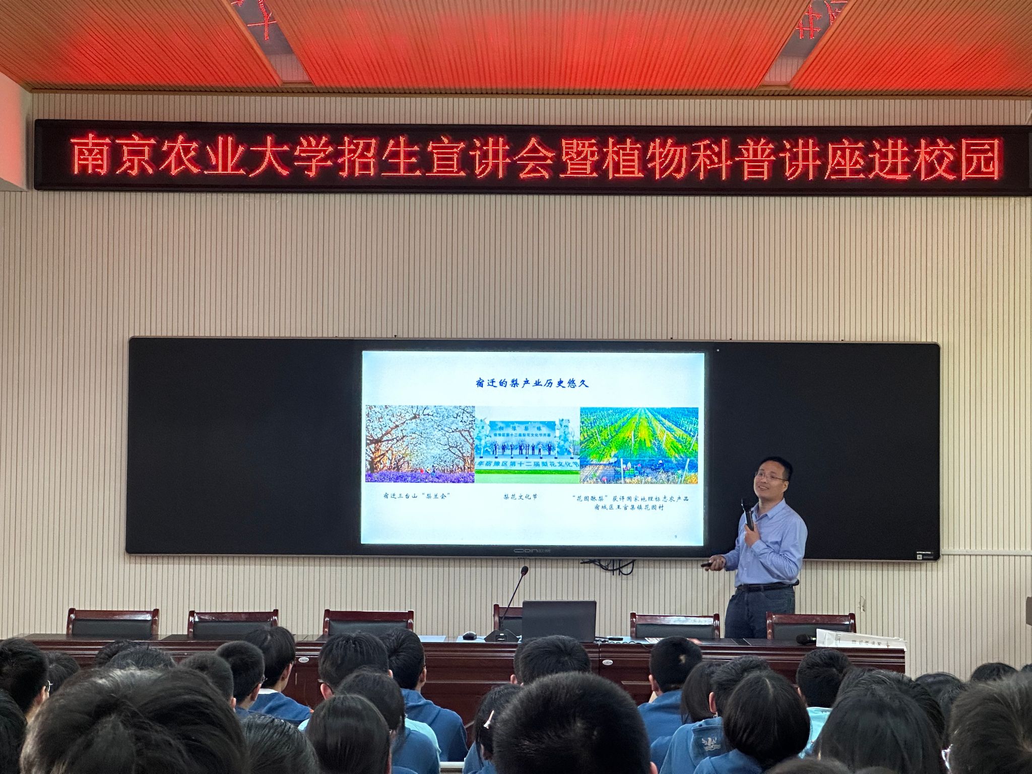 党委副书记石木舟、副教授王鹏、辅导员崔洋一行赴江苏省宿迁市泗洪中学开展招生宣讲会暨植物科普讲座进校园活动。泗洪中学党委委员、副校长许磊及高二年级150余名学生参加了此次活动。