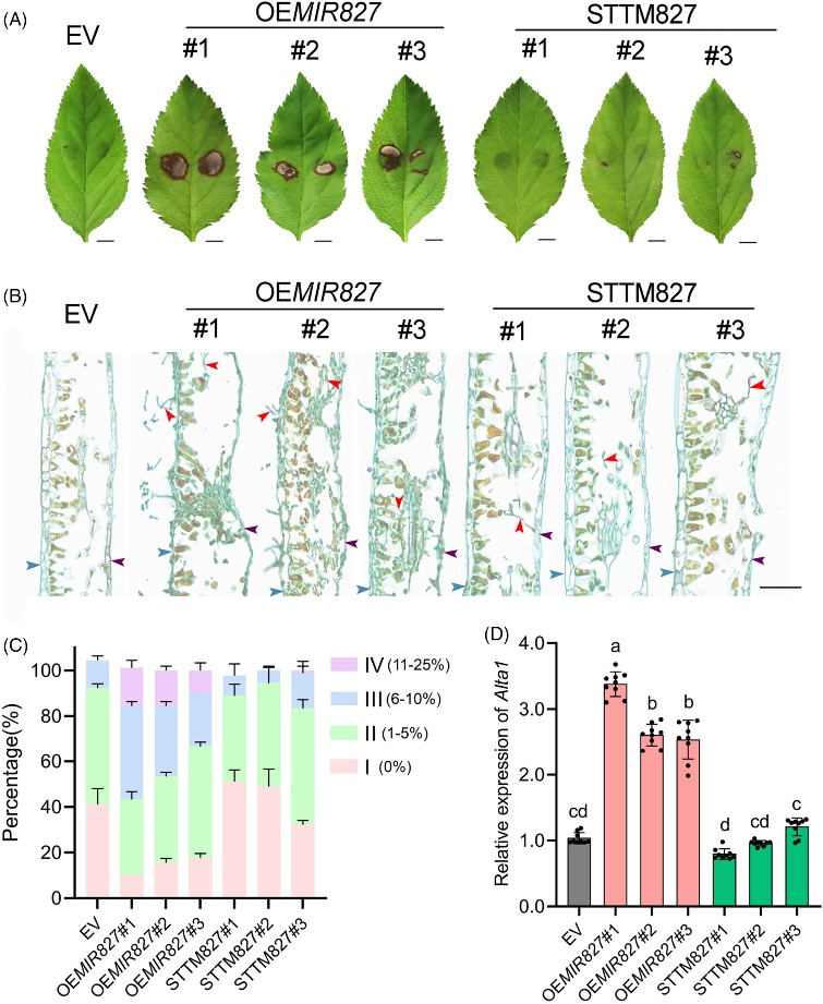 该研究发现,湖北海棠miR827响应链格孢菌侵染下调表达。构建miR827过表达/抑制的转基因苹果株系,抗性评价结果表明,miR827是斑点落叶病抗性的负调控因子。进一步,利用5’RLM-RACE和烟草共转化试验证实,miR827特异性靶向苹果PHT5-2和PHT5-3基因,通过mRNA剪切的方式调控其表达。明确PHT5-2/3受链格孢菌侵染诱导,过表达PHT5-2或PHT5-3的转基因苹果株系表现出更强的抗侵染能力。