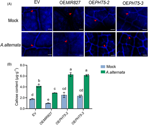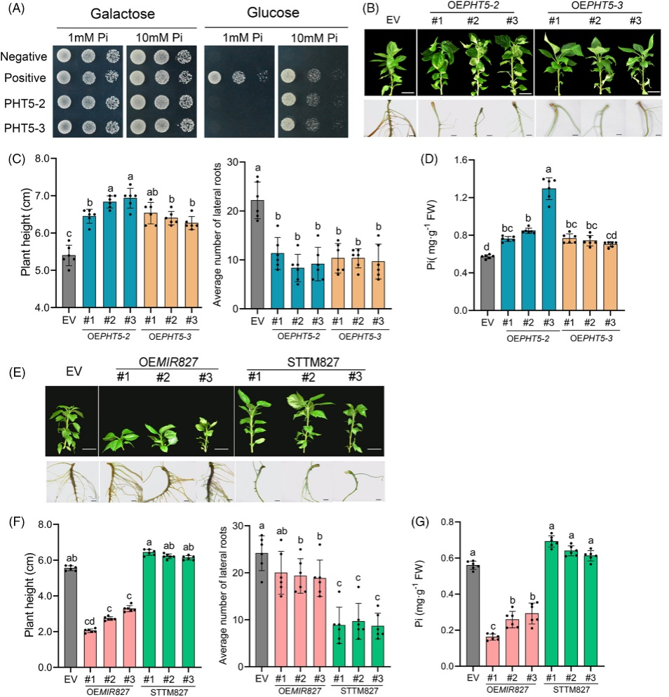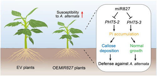 进一步研究发现,PHT5-2和PHT5-3基因编码低亲和性磷转运蛋白,过表达PHT5-2/3提高苹果磷含量,增强植株生长势,而miR827过表达株系的磷含量降低,生长减弱。研究还发现,磷浓度与苹果的斑点落叶病抗性正相关;高供磷水平和PHT5-2/3过表达都会引起叶片细胞壁胼胝质增加积累,而低磷条件或过表达miR827则显著抑制侵染诱导的胼胝质沉积。