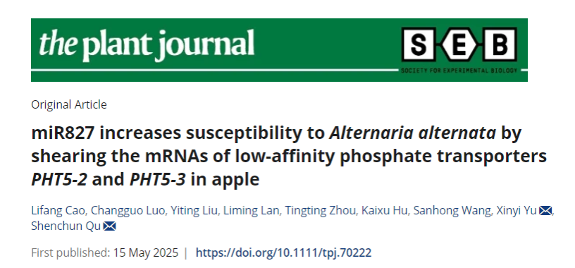 渠慎春教授团队在The Plant Journal期刊上发表了题为“miR827 increases susceptibility to Alternaria alternata by shearing the mRNAs of low-affinity phosphate transporters PHT5-2 and PHT5-3 in apple”的研究论文。该研究报道了miR827-PHT5-2/3模块通过调节植株磷稳态调控苹果种质的斑点落叶病抗性。