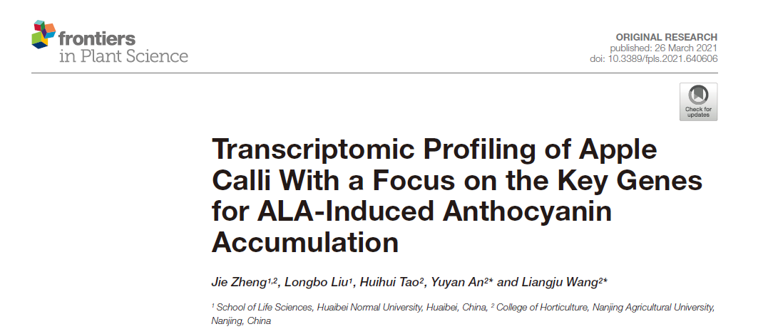 果树学科博士毕业生郑洁(现为淮北师范大学讲师),通讯作者为汪良驹教授和安玉艳副教授。该研究得到国家自然科学基金(31772253)、安徽省自然科学基金(1908085QC108)和安徽省高校自然科学研究项目(KJ2020A0043)的共同资助。郑洁博士在校就读期间就一直从事ALA促进苹果花青苷积累效应与机理研究,曾经在Scientia Horticulturae、Plant Cell, Tissue and Organ Culture和Physiologia Plantarum等国际期刊发表学术论文。本研究既是她博士学位论文的一部分,也是博士毕业后持续研究成果的一部分。可以相信,经过多年努力,汪良驹教授团队ALA对果树生长发育的调控机制将会越来越清晰。