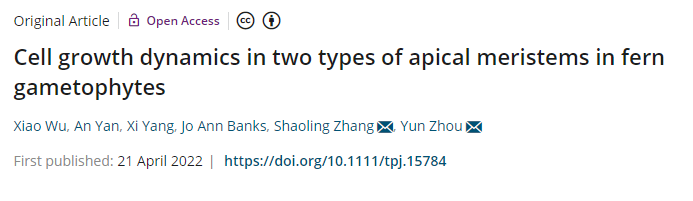 等单位的“Cell growth dynamics in two types of apical meristems in fern gametophytes”研究成果作为封面论文发表在《The Plant Journal》(2022,111:149-163)。作者通过自己建立的无创延时共聚焦成像和二维成像分析系统定量确定了蕨类Woodsia obtusa配子体中两种不同类型的顶端分生组织的细胞生长动态——顶端初始中心(apical cells)分生组织和多细胞顶端分生组织(multicellular apical meristems)。同时明确了维持或终止顶端初始细胞分裂和生长的独特模式以及顶端初始中心分生组织如何转变为多细胞顶端分生组织,并推动蕨类植物顶端分生组织的增殖。定量结果表明小细胞与蕨类配子体中活跃的细胞分裂相关。蕨类配子体多细胞顶端分生组织的外层细胞经历垂周分裂和平周分裂,进而增加细胞数量和细胞层数。