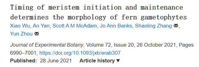陆地植物的世代交替发生在孢子体和配子体阶段之间。种子植物孢子体发育出自我维持的多细胞分生组织,这些分生组织决定了其组织结构。而种子植物配子体缺乏分生组织不能独立存活。相比之下,包括蕨类植物在内的无种子维管植物配子体和孢子体相互独立存活,均通过形成分生组织维持其生长和增殖。与种子植物孢子体中分生组织报道相比,研究者对蕨类配子体中分生组织发育的细胞机制了解甚少。