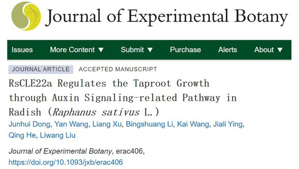 萝卜遗传育种团队题为“RsCLE22a Regulates the Taproot Growth through Auxin Signaling-related Pathway in Radish (Raphanus sativusL.)” 的研究论文,初步揭示了形成层特异性CLE22短肽通过调节维管形成层区域生长素的积累,并与RsWOX4基因形成负反馈调节环,精确调控萝卜肉质根维管形成层活性,进而参与肉质根形态建成过程的分子机制。