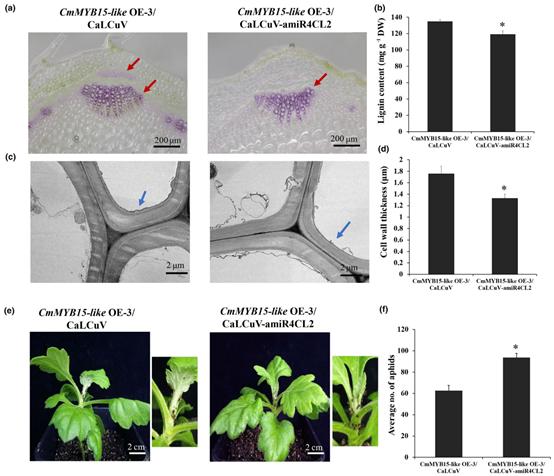 图2 CmMYB15-like调控的木质素合成和对菊花抗蚜性的提高依赖于Cm4CL2
