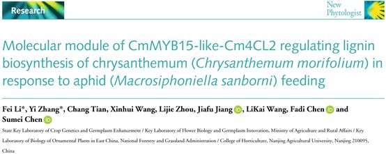 菊花遗传与种质创新团队在New Phytologist发表了题为“Molecular Module of CmMYB15-like-Cm4CL2 Regulating Lignin Biosynthesis of Chrysanthemum (Chrysanthemum morifolium) in Response to Aphid (Macrosiphoniella sanbourni) Feeding”的研究论文,揭示了菊花中CmMYB15-like-Cm4CL2分子模块调控菊花响应蚜虫取食从而促进木质素合成的分子机制。