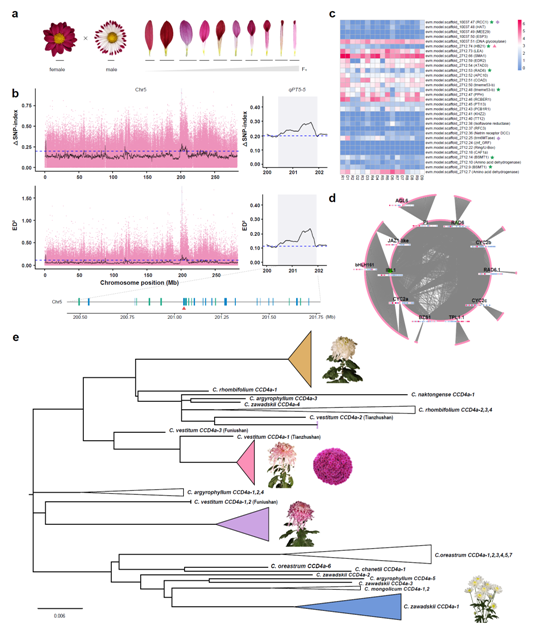 基于基因组序列,团队利用BSA+WGCNA方法鉴定了多个菊花花型发育调控基因(图4)。通过对CCD4a基因的系统发育分析,发现中国传统菊和园林小菊、日本传统菊及欧美切花菊具有独立的花色育种历史;这也与菊花起源于中国,最初为黄色,至唐代开始出现少量白色、紫色新品种并传入日本,至明清传入欧洲的历史文献相符。