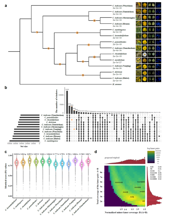 陈发棣团队在Nature Communications上发表了题为Analyses of a chromosome-scale genome assembly reveal the origin and evolution of cultivated chrysanthemum的研究成果。该研究破译了六倍体栽培菊花基因组,报道了国际上首个节段异源多倍体基因组(segmental allopolyploid),深入探究了栽培菊花的起源和育种历史,也为下一步解析菊花重要园艺性状(花型、花色、株型、抗逆等)形成的分子机制和定向育种奠定了基础。