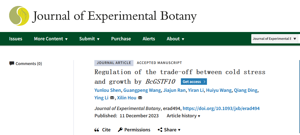 白菜系统生物学创新团队在JOURNAL OF EXPERIMENTAL OF BOTANY在线发表了题为“Regulation of the trade-off between cold stress and growth by BcGSTF10”的研究论文。该研究揭示了BcGSTF10基因在协调植物生长发育和低温响应中的分子机理。
