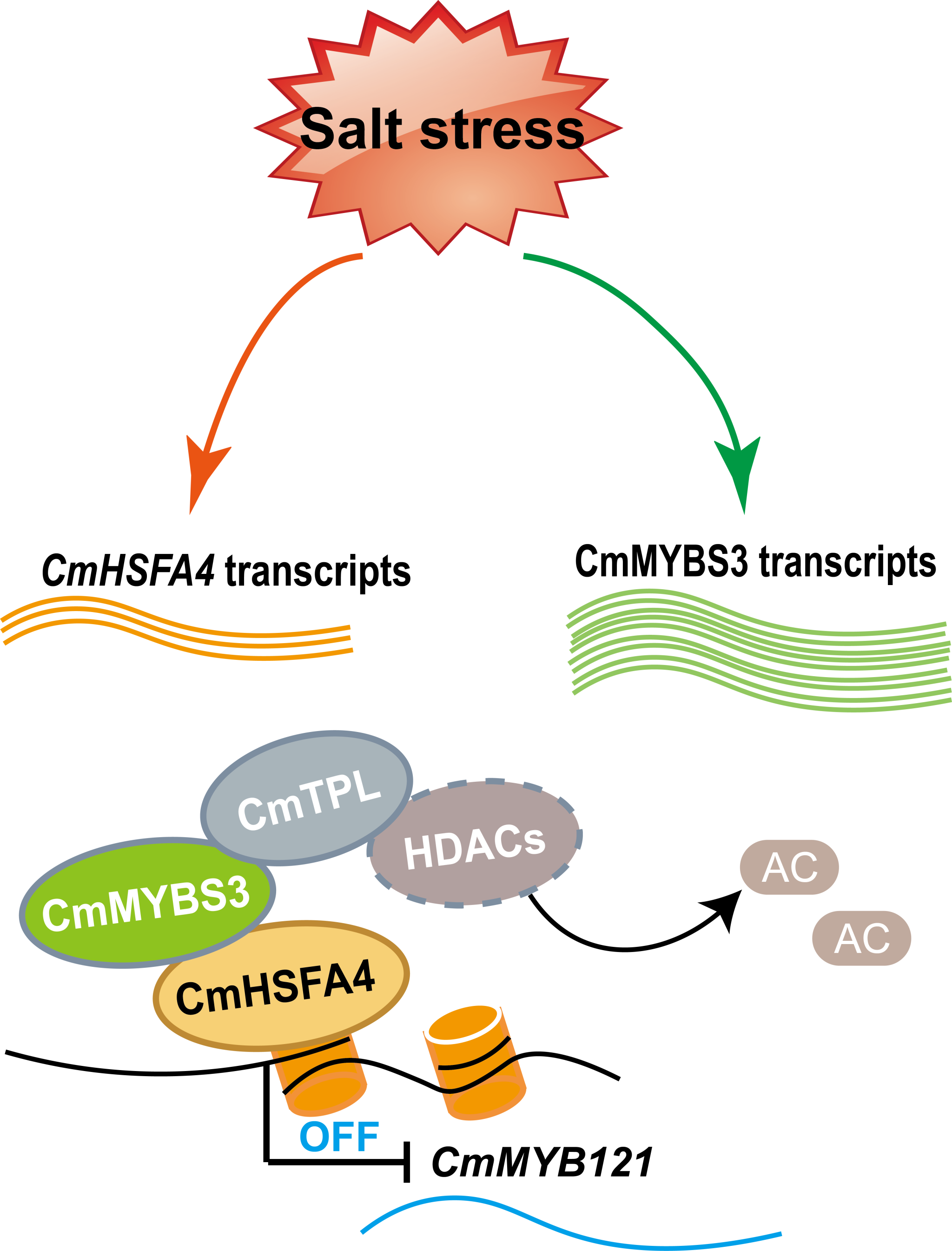 菊花遗传与种质创新团队在国际学术期刊Plant Physiology发表了题为“Transcription factor CmHSFA4-CmMYBS3 complex enhances salt tolerance in chrysanthemum by repressing CmMYB121expression”的研究论文,揭示了CmHSFA4-CmMYBS3-CmTPL蛋白复合体通过抑制下游靶基因CmMYB121启动子区乙酰化水平抑制该基因表达,进而正向调控菊花耐盐性的机制。