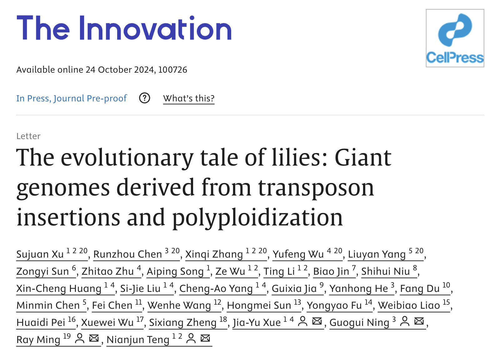 滕年军教授团队、薛佳宇副教授团队,华中农业大学园艺林学学院宁国贵教授团队与福建农林大学明瑞光教授团队等国内10多家科研团队联合公布了百合高质量染色体级别基因组,成为世界上首个正式报道的最大植物基因组。包子漫画相关的文章“The evolutionary tale of lilies: Giant genomes derived from transposon insertions and polyploidization”发表在《The Innovation》期刊。