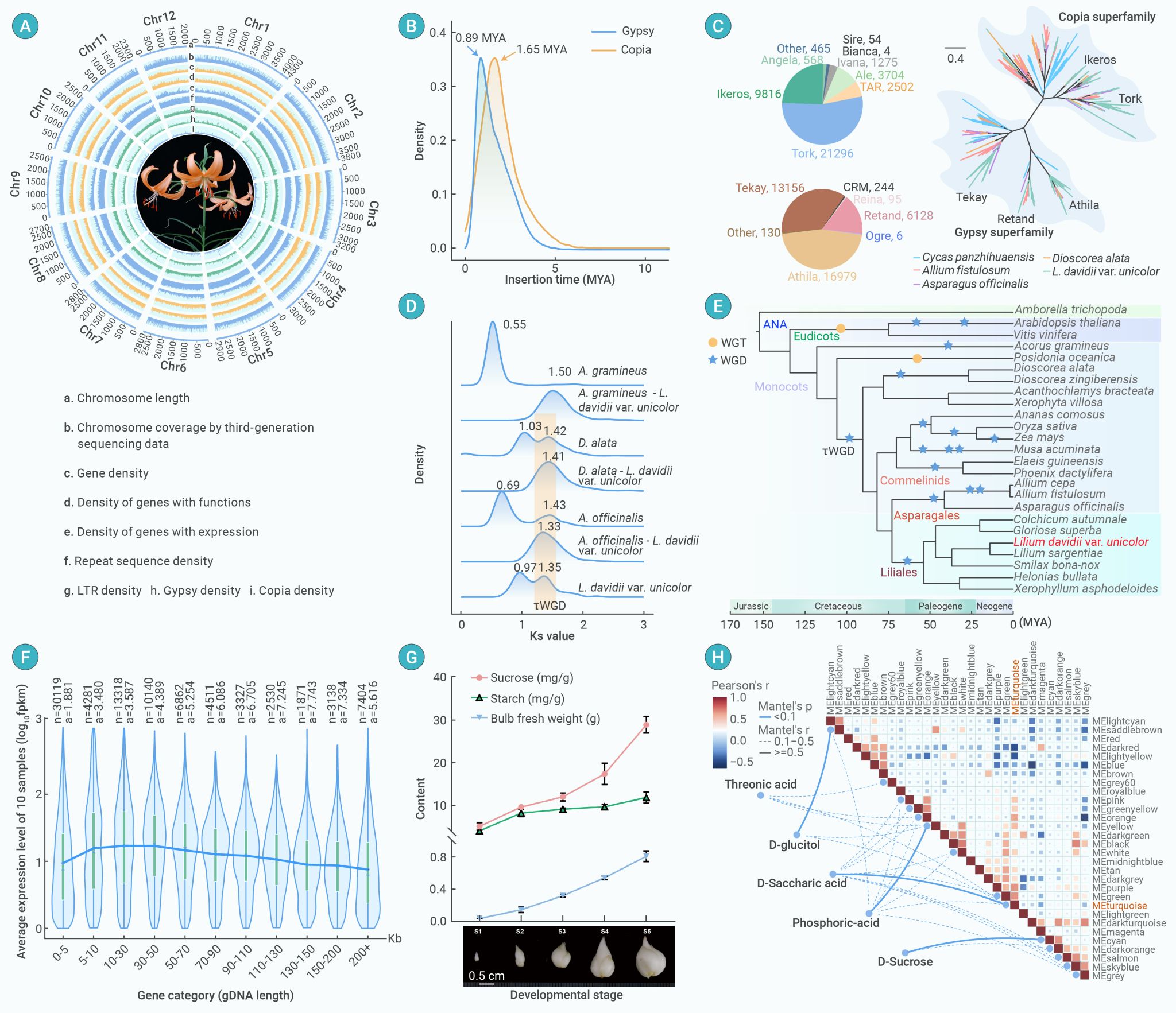 百合(Lilium L.)是单子叶百合目百合科多年生植物,因其极高的观赏、食用与药用价值而备受关注。本研究利用Nanopore、Illumina和Hi-C测序技术,以及优化的组装方法,获得了36.68 Gb的兰州百合(Lilium davidii var. unicolor)超大型基因组,并解析了其形成机制和特征,也揭示了鳞茎营养物质积累的遗传基础。这一成果标志着百合的分子研究进入新时代,也是植物基因组学的重要突破性研究进展之一。论文的主要研究内容具体如下: