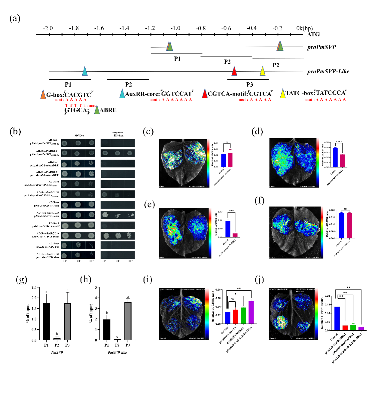 酵母单杂交、双荧光素酶报告基因和CHIP-qPCR实验表明,PmRGL2蛋白与PmSVP启动子内的G-box和ABRE元件结合,同时PmRGL2蛋白可以结合PmSVP-like启动子中的TATC-box元件结合。进一步研究发现,PmFRL3蛋白增强了PmRGL2蛋白对下游基因的调节作用。