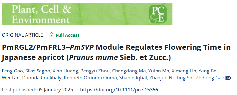 高志红教授团队针对这一问题在植物科学领域经典期刊Plant, Cell & Environment(中科院一区TOP期刊,5年影响因子7.6)上发表题为“PmRGL2/PmFRL3–PmSVP Module Regulates Flowering Time in Japanese apricot (Prunus mume Sieb. et Zucc.)”的研究论文。该研究阐明了PmRGL2/PmFRL3蛋白复合体响应GA信号和低温积累并通过PmSVP和PmSVP-like调控梅开花时间,为全面揭示木本植物季节性休眠解除与花开放时间的关联分子机制提供了新的思路。