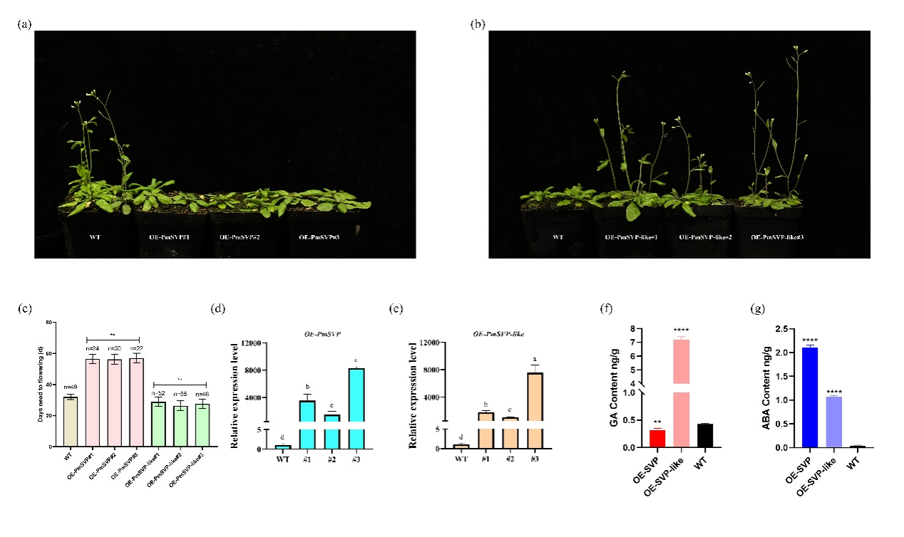 为了进一步验证PmSVP和PmSVP-like的功能,作者进行了拟南芥遗传转化实验。转基因表型观察表明,OE-PmSVP-like的转基因植株比野生型开花更早,而OE-PmSVP转基因植株表现出晚花表型。激素在开花过程中起着关键作用,OE-PmSVP-like中的GA含量高于OE-PmSVP,但有趣的是,ABA的含量恰恰相反。这与以前的研究一致,在打破休眠和开花机制中,ABA的功能是维持休眠和抑制开花,而GA是打破休眠并促进开花(Wen et al. 2016; Zhuang et al. 2013)。