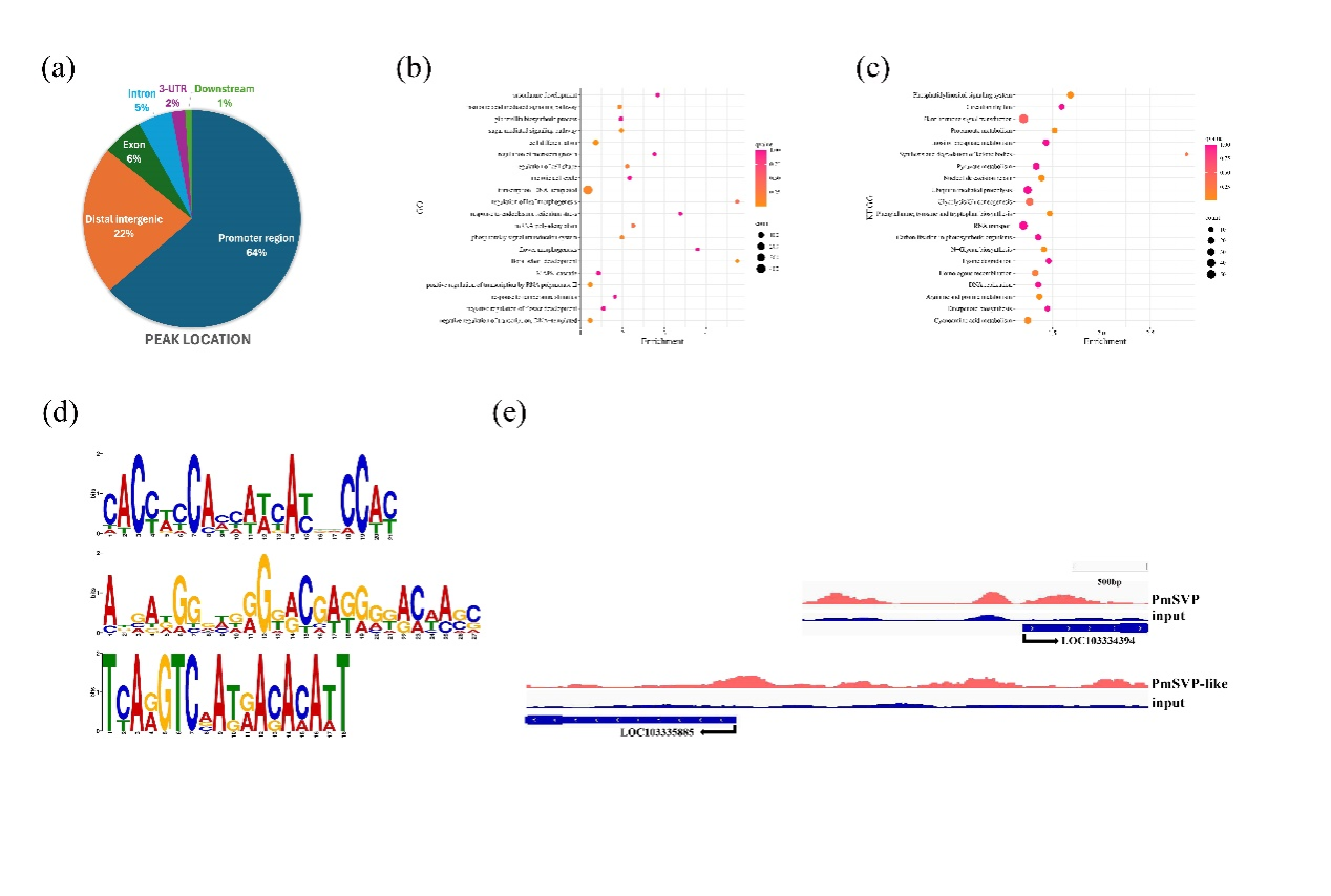 为了解析PmRGL2在梅中的转录调控,作者在花芽发育的四个关键阶段构建了ChIP-Seq文库。在抑制性休眠(para-dormancy)、生理休眠(endo-dormancy)和生态休眠(eco-dormancy)和休眠解除(dormancy release)阶段分别获得了5478、2666、1845和827个独特的峰。全基因组分析鉴定到了两个MCM1-AGAMOUSDEFICIENS Serum Response Factor box (MADS box)蛋白SHORT VEGETATIVE PHASEs(SVPs)。