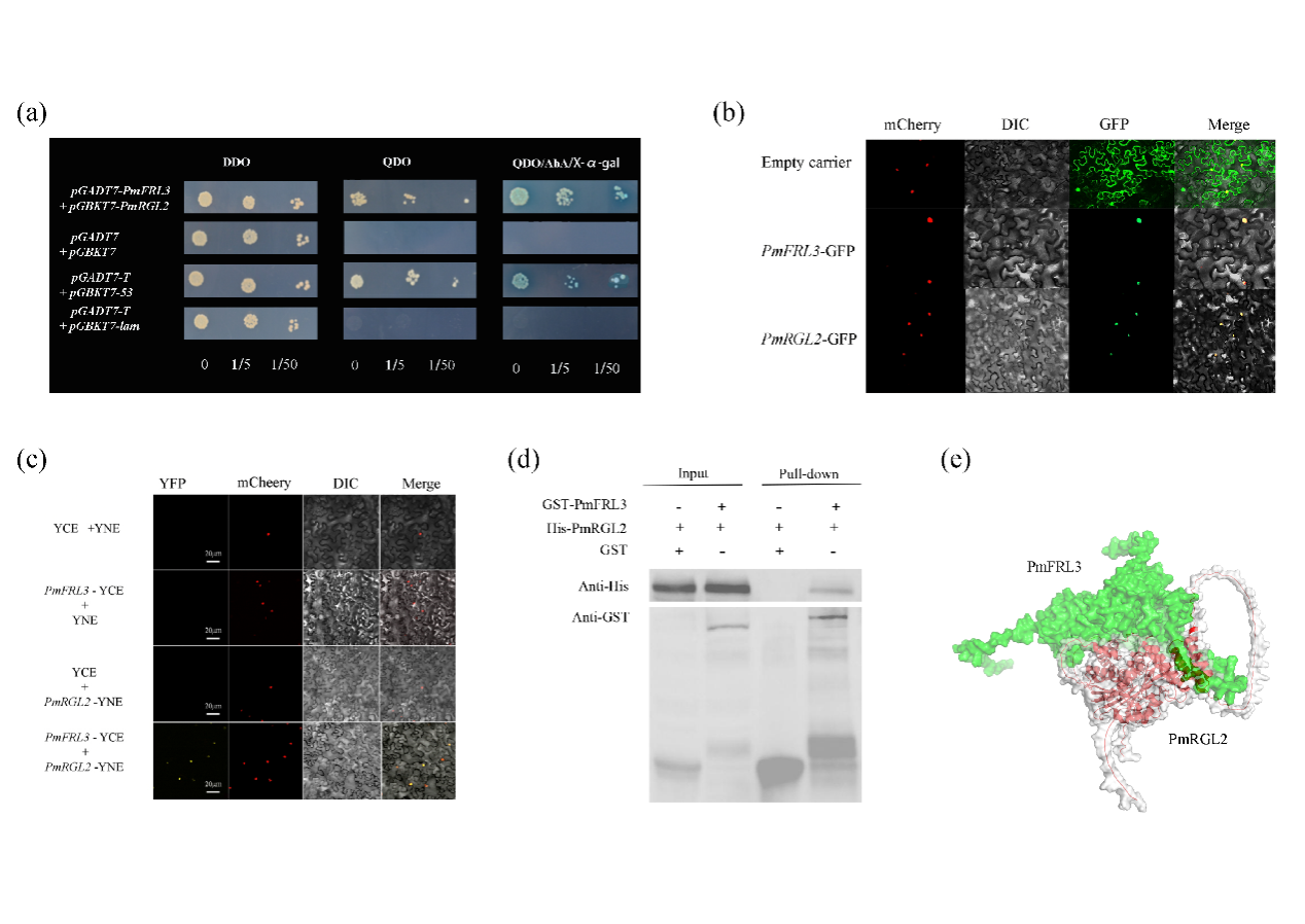· 花芽休眠受到环境因素和内源激素的影响。研究小组前期研究发现GA4处理可以打破梅树花芽的季节性休眠,提早开花,同时鉴定到了赤霉素(GA)信号通路关键阻遏因子DELLA蛋白PmRGL2负向调节GA信号调控梅的休眠和开花转换过程(Gao et al.2020(DOI: 10.1007/s11103-020-01070-3);Lv et al.2018; Zhuang et al. 2013),但休眠解除的分子调控机制尚不清晰。梅花芽休眠的解除和开花是两个密切相关的生理现象,为了系统了解梅花芽的休眠和开花特征,团队连续多年采用水培法鉴定梅不同品种的需冷量,进一步明确了花芽的四个休眠关键时期。本研究作者以PmRGL2为靶蛋白进行酵母双杂交筛库,筛选到一个FRIGIDA-Like蛋白PmFRL3, Y2H、BiFC、Pull-down实验均证实PmRGL2和PmFRL3在细胞核内存在相互作用。