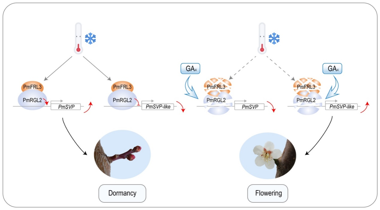 图6. PmRGL2/PmFRL3-PmSVP模块调控果梅芽休眠和开花的模型