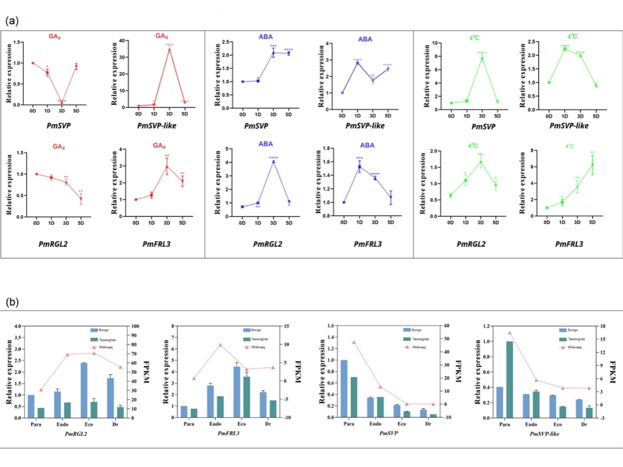 GA抑制了梅的休眠,促进了梅的开花。GA和ABA的表达模式相反,在休眠释放过程中,GA逐渐增加,ABA逐渐减少,这两者在分子水平上拮抗性地参与了梅休眠的调节。此外GA4可以代替梅的部分需冷量,提前打破季节性休眠(Wen et al. 2016; Zhuang et al. 2013)。PmSVP、PmSVP-like、PmRGL2和PmFRL3在GA4、ABA和4℃处理中表现出特异性反应,调控梅休眠和开花。对梅花芽发育的四个关键时期进行qRT-PCR和RNA-seq分析表明PmFRL3和PmRGL2的表达量呈现相同的趋势,晚花品种的相对表达量均高于早花品种。它通常在休眠期间增加,然后在开花时减少,表明它起着抑制开花作用。PmSVP在早花品种中的相对表达量低于晚花品种,而PmSVP-like的情况正好相反。